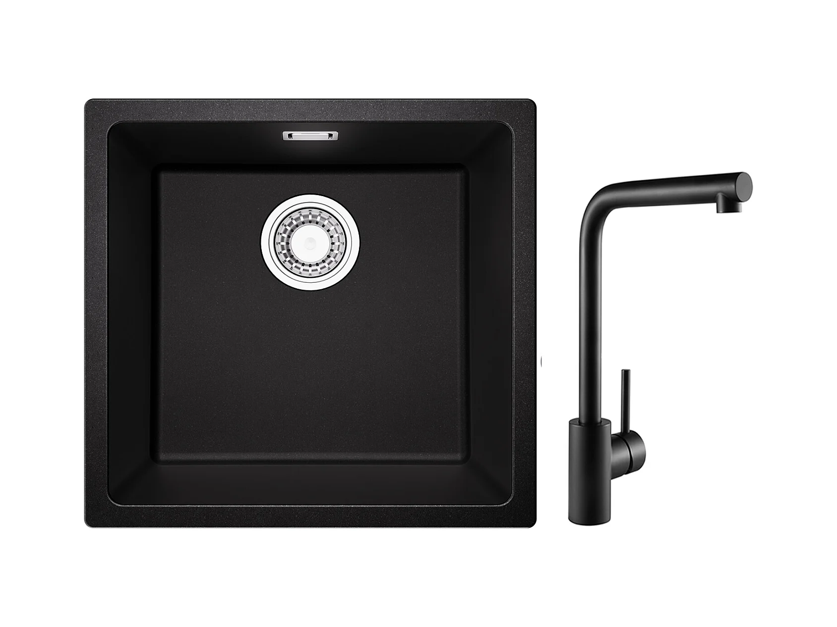 Evier 1 Bac en Quartz et Résine, 3 Options de Montage, 45*44*20cm + Mitigeur de Cuisine en Inox Noir