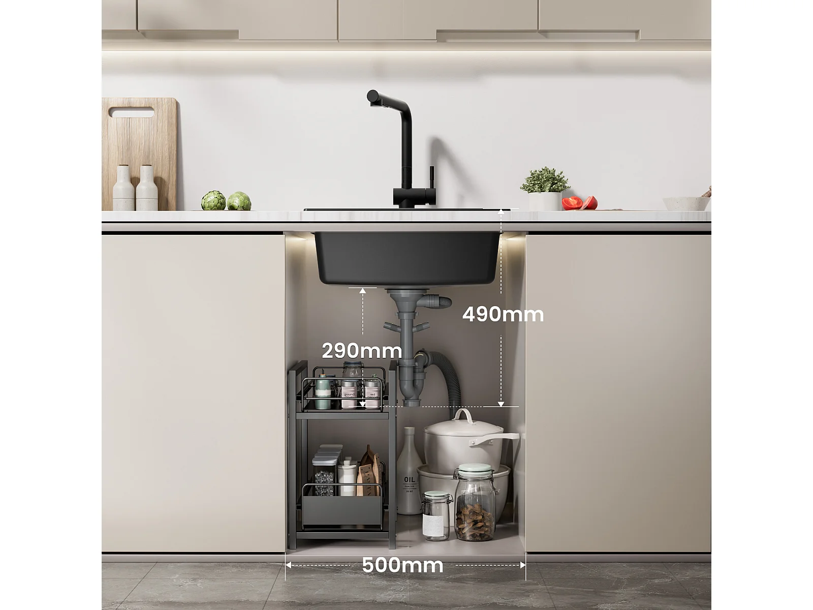 Evier 1 Bac en Quartz et Résine, 3 Options de Montage, 50*44*20cm + Mitigeur de Cuisine en Inox Noir