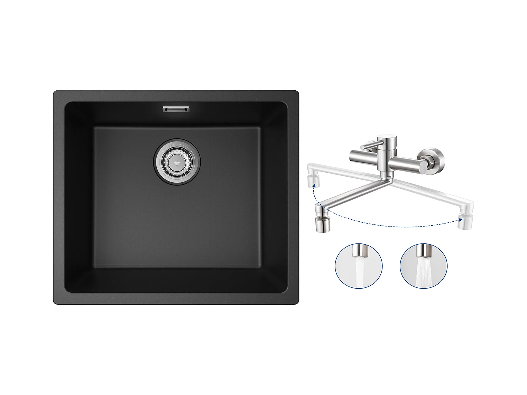 Evier 1 Bac en Quartz et Résine, 3 Options de Montage, 50*44*20cm + Mitigeur de Cuisine Mural avec 2 Jets Brossé