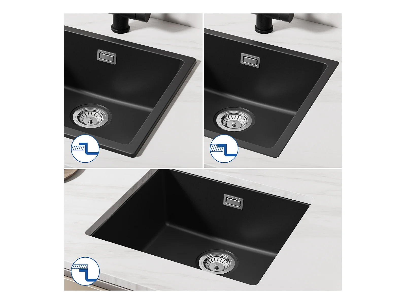 Evier 1 Bac en Quartz et Résine, 3 Options de Montage, 50*44*20cm + Robinet de Cuisine à eau Froide,Noir