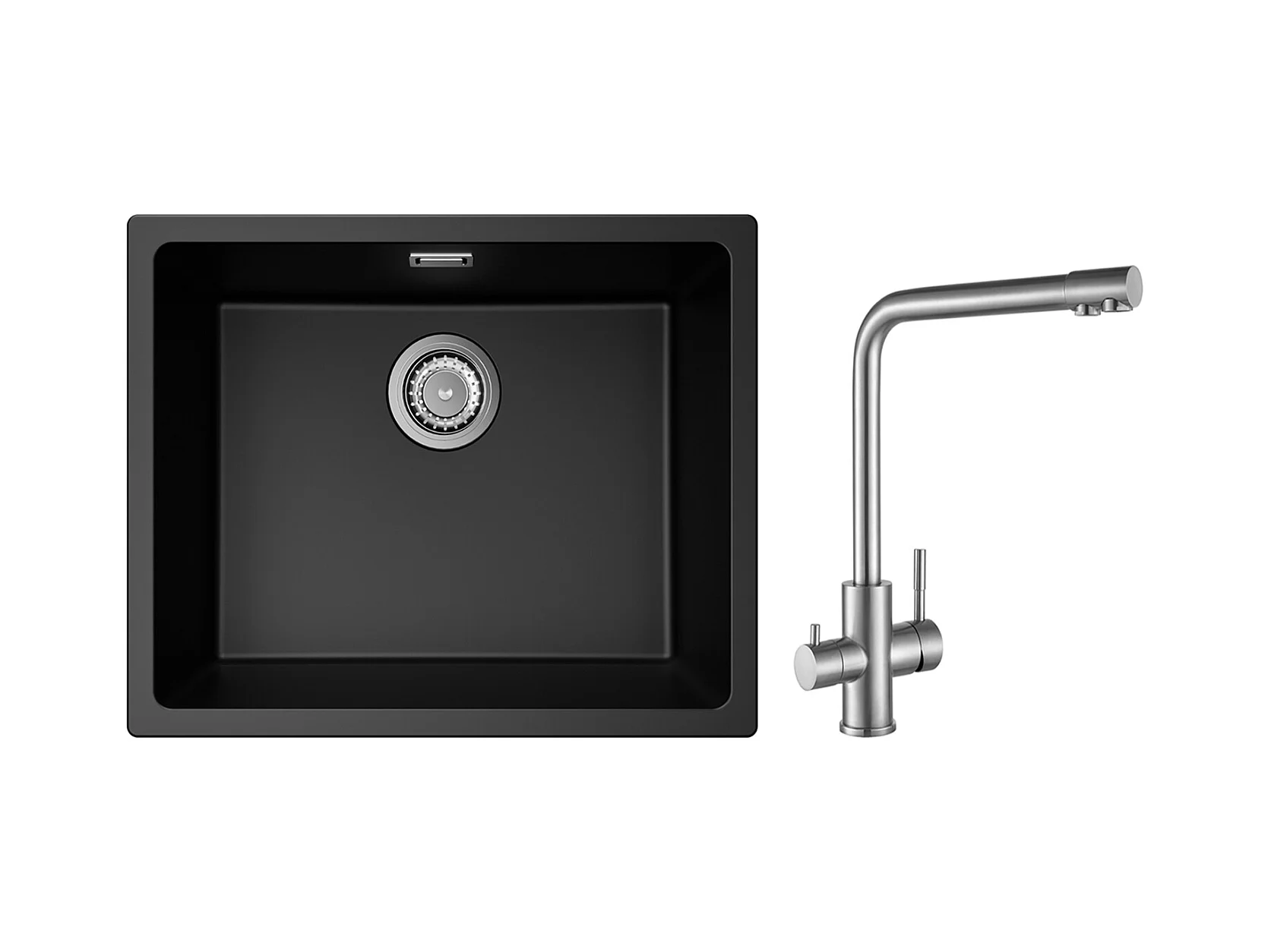 Evier 1 Bac en Quartz et Résine, 3 Options de Montage, 55*44*20cm + Mitigeur Evier à 3 Voies, 2 Leviers, Noir