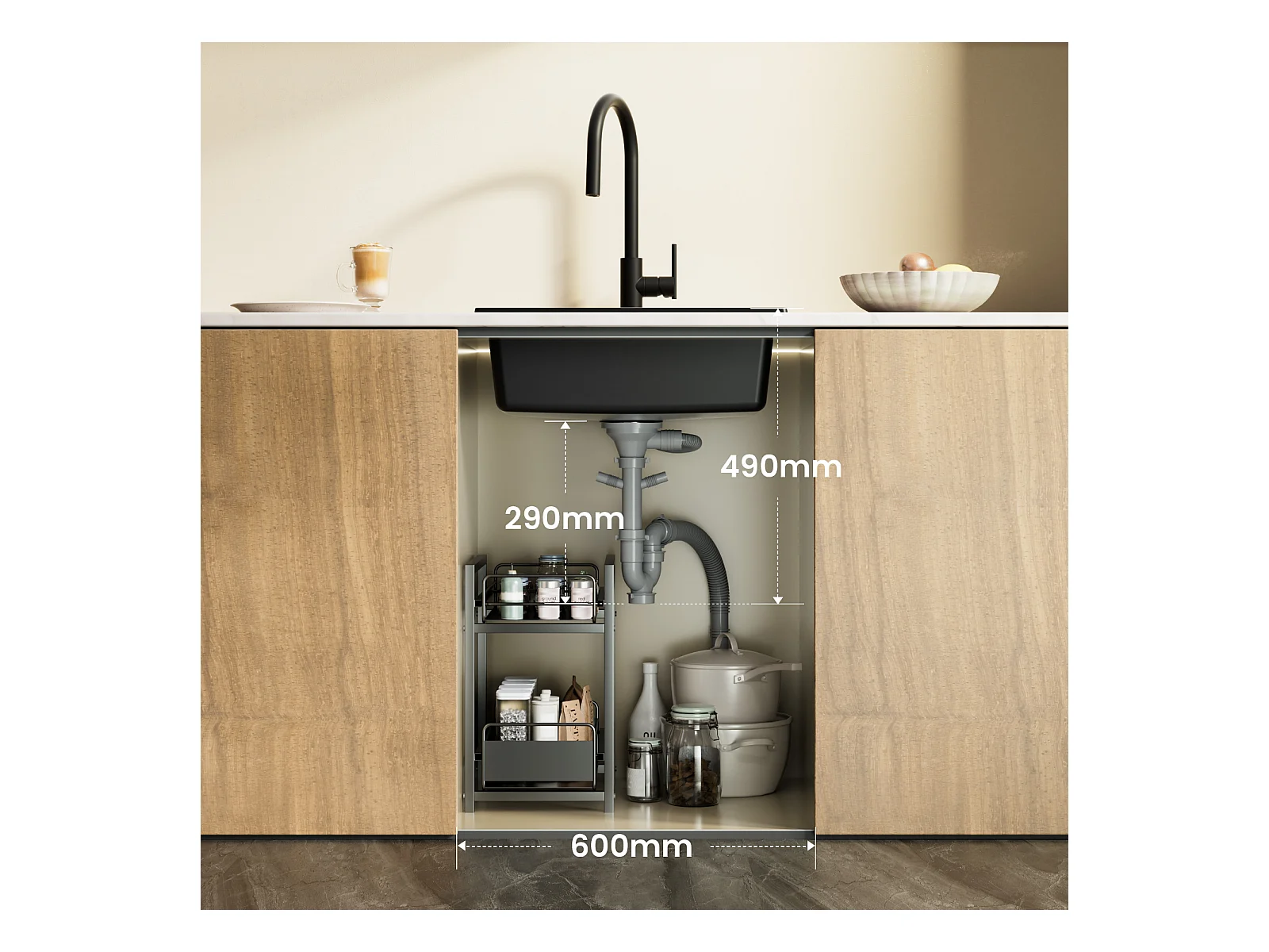 Evier 1 Bac en Quartz et Résine, 3 Options de Montage, 55*44*20cm + Mitigeur Cuisine Avec Douchette Extractible