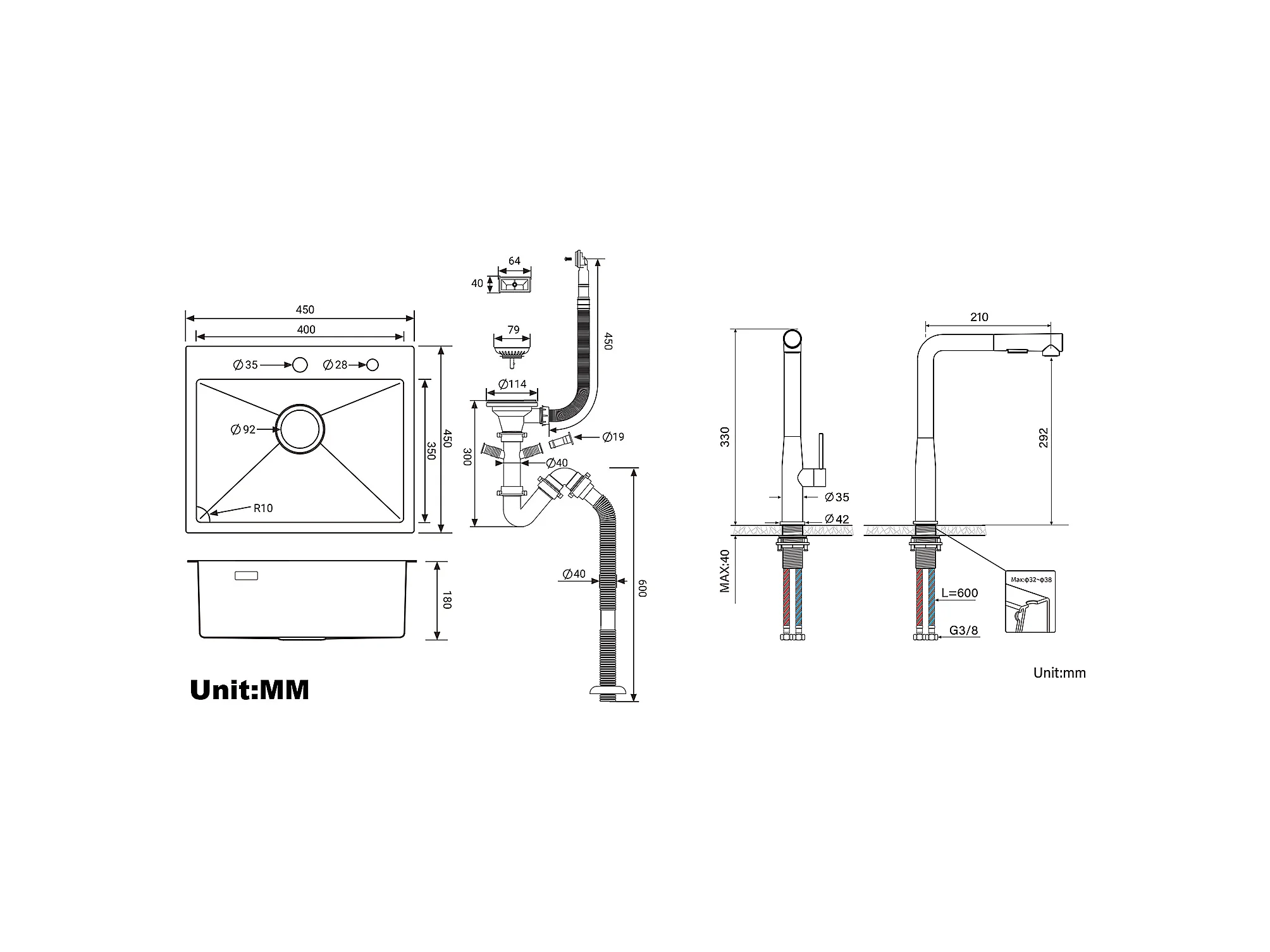 Évier Cuisine 1 Bac 45x45CM Acier Inoxydable 304 ,encastré et à Poser+Mitigeur Cuisine avec Douchette Extractible Rotatif 360°,Brossé