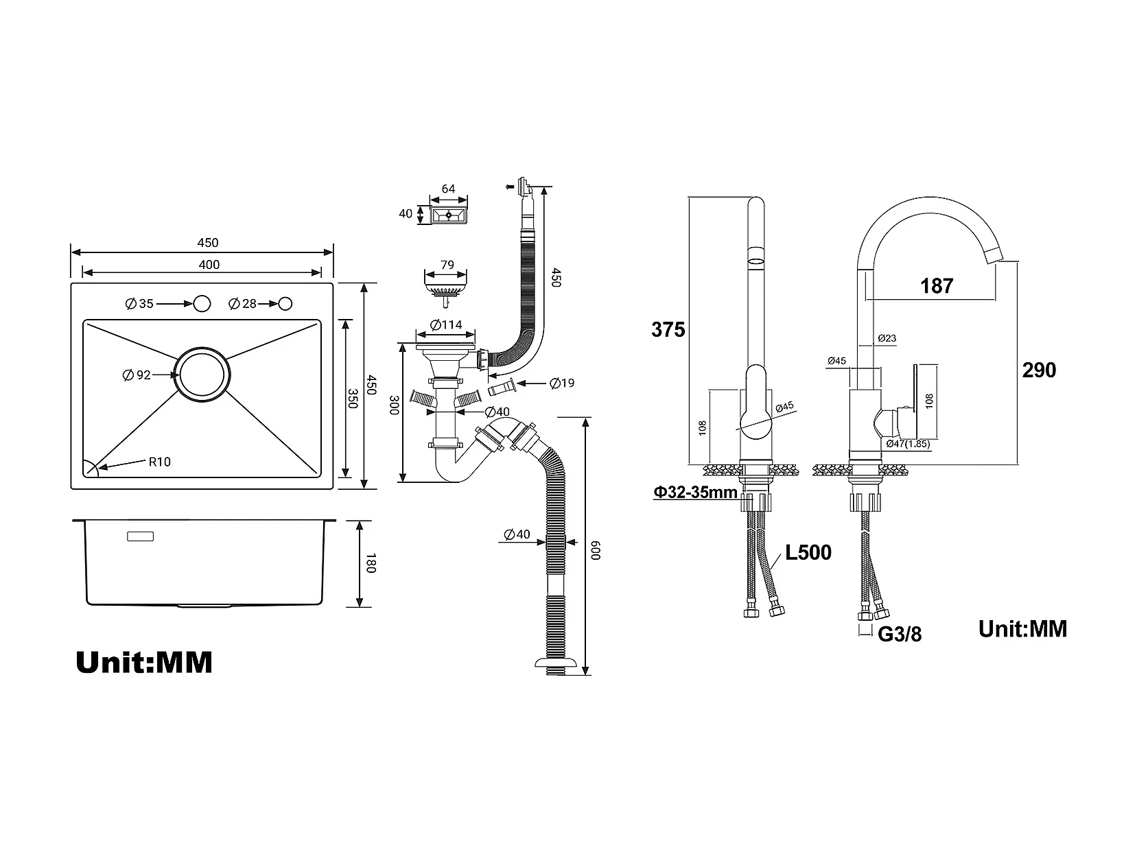 Évier Cuisine 1 Bac 45x45CM Acier Inoxydable 304+Robinet de Cuisine avec Douchette Extractible Rotatif 360 °2 Fonctions, Barboteur démontable,Noir