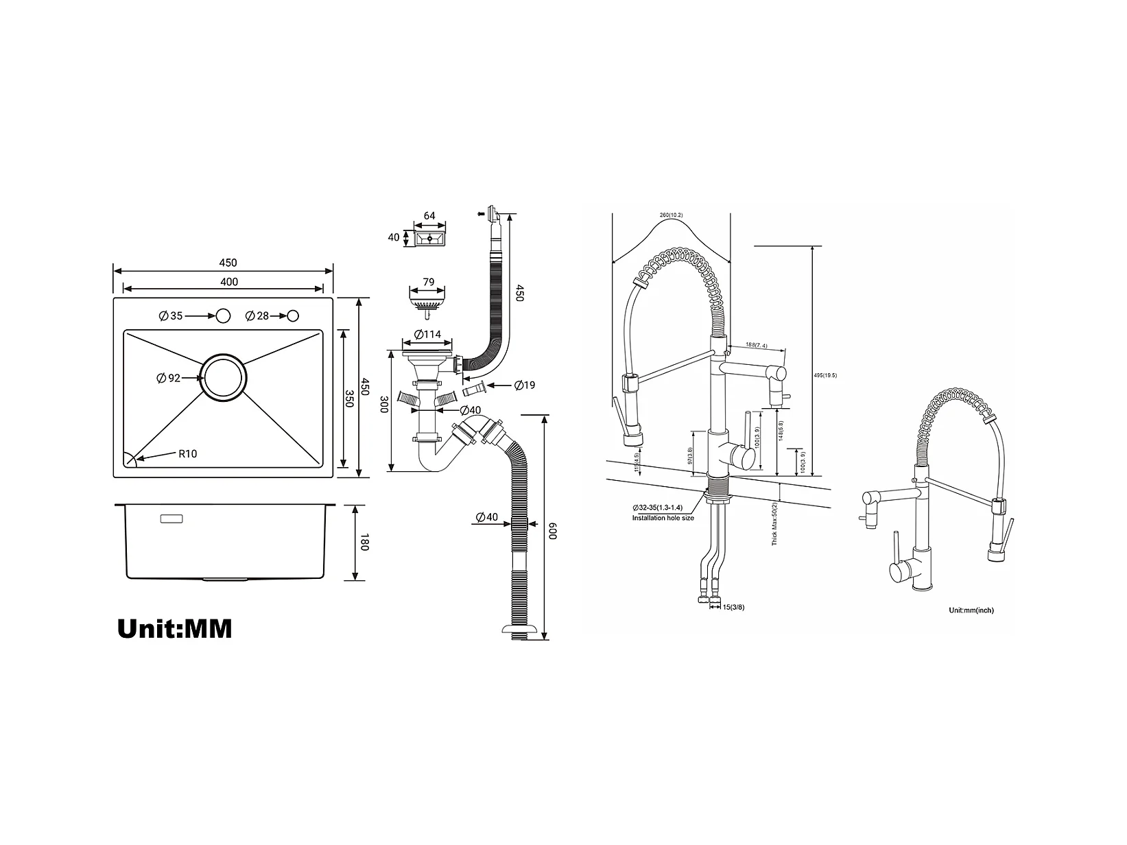 Évier Cuisine 1 Bac 45x45CM Acier Inoxydable 304 ,encastré et à Poser +robinet de cuisine rétractable à deux fonctions, Noir,EU Modèle