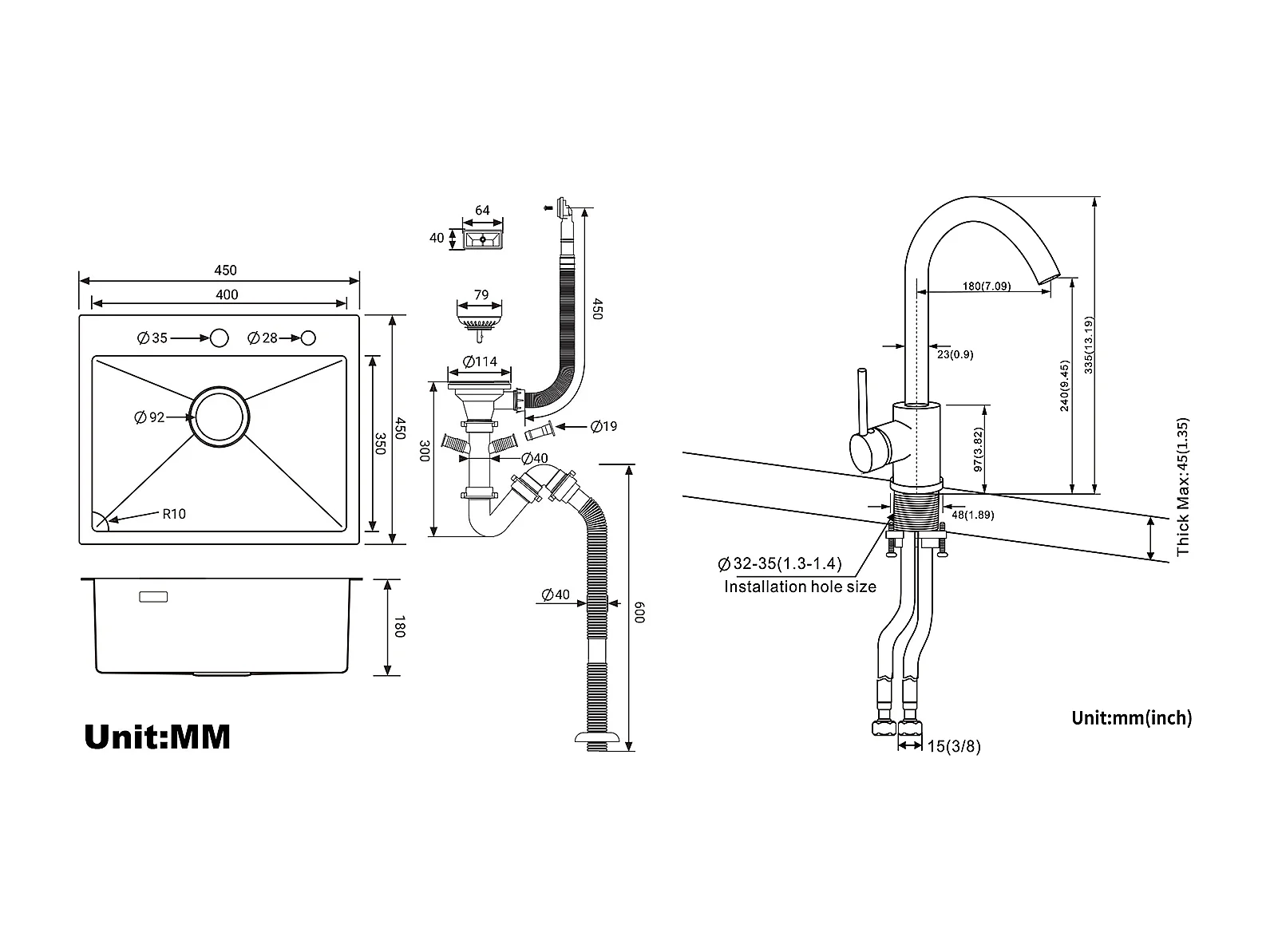 Évier Cuisine 1 Bac 45x45CM Acier Inoxydable 304 ,encastré et à Poser+Robinet de Cuisine Flexible Bec Haut Orientable