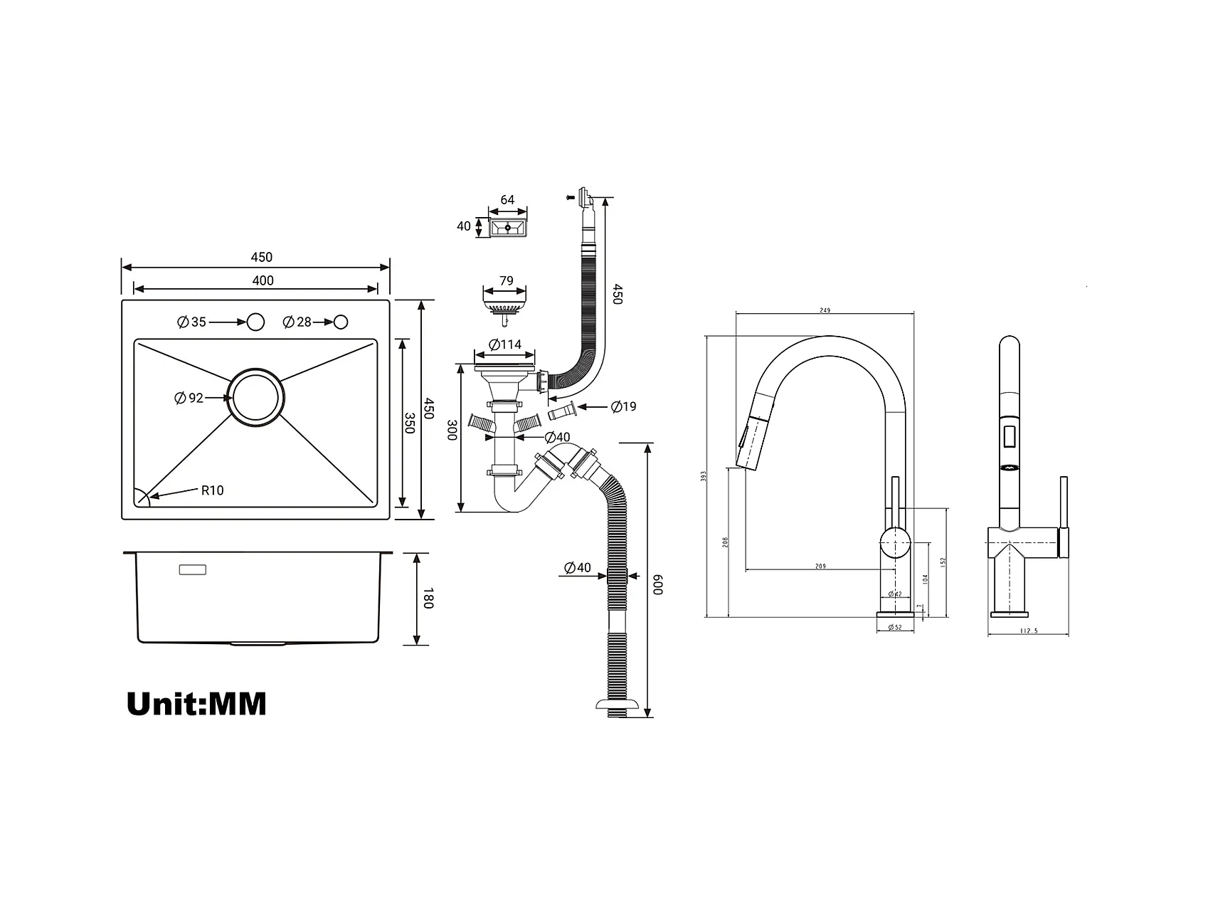 Évier Cuisine 1 Bac 45x45CM Acier Inoxydable 304 ,encastré et à Poser +robinet de cuisine rétractable à deux fonctions, Noir,EU Modèle
