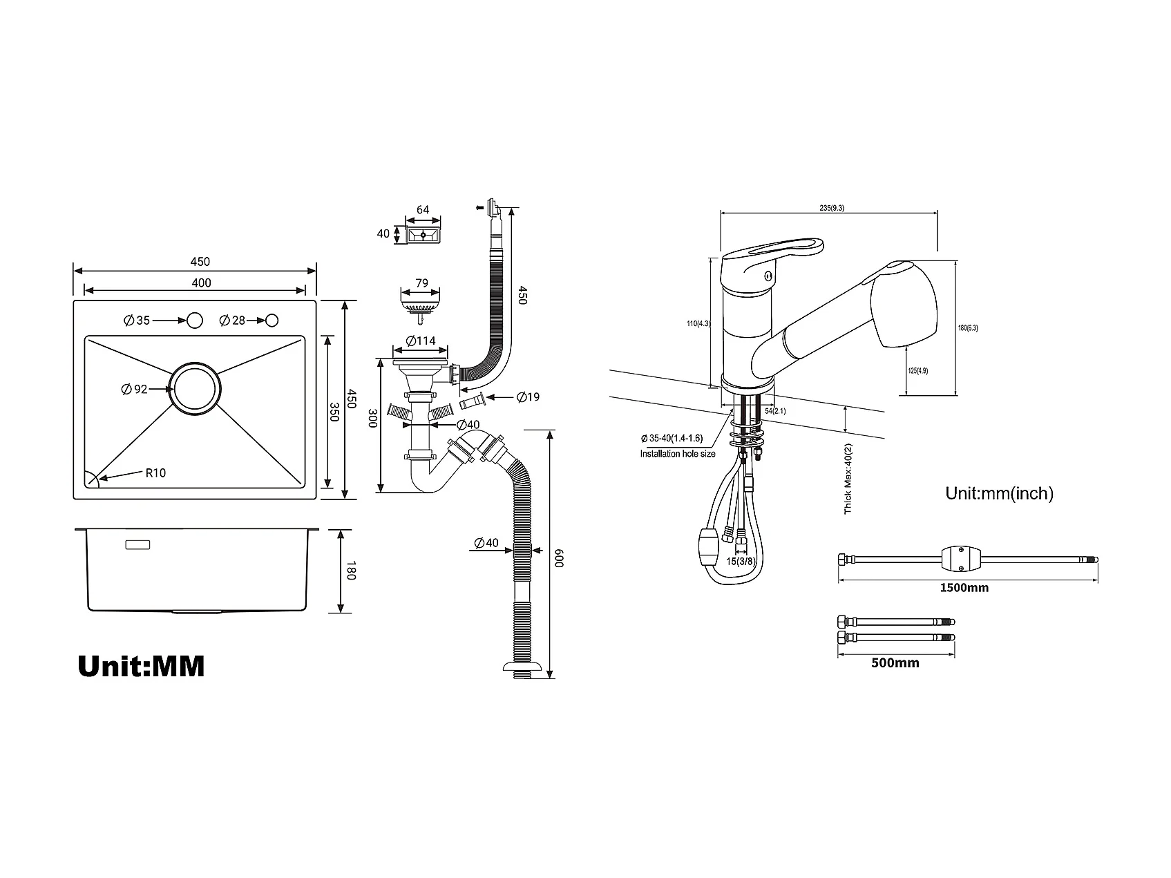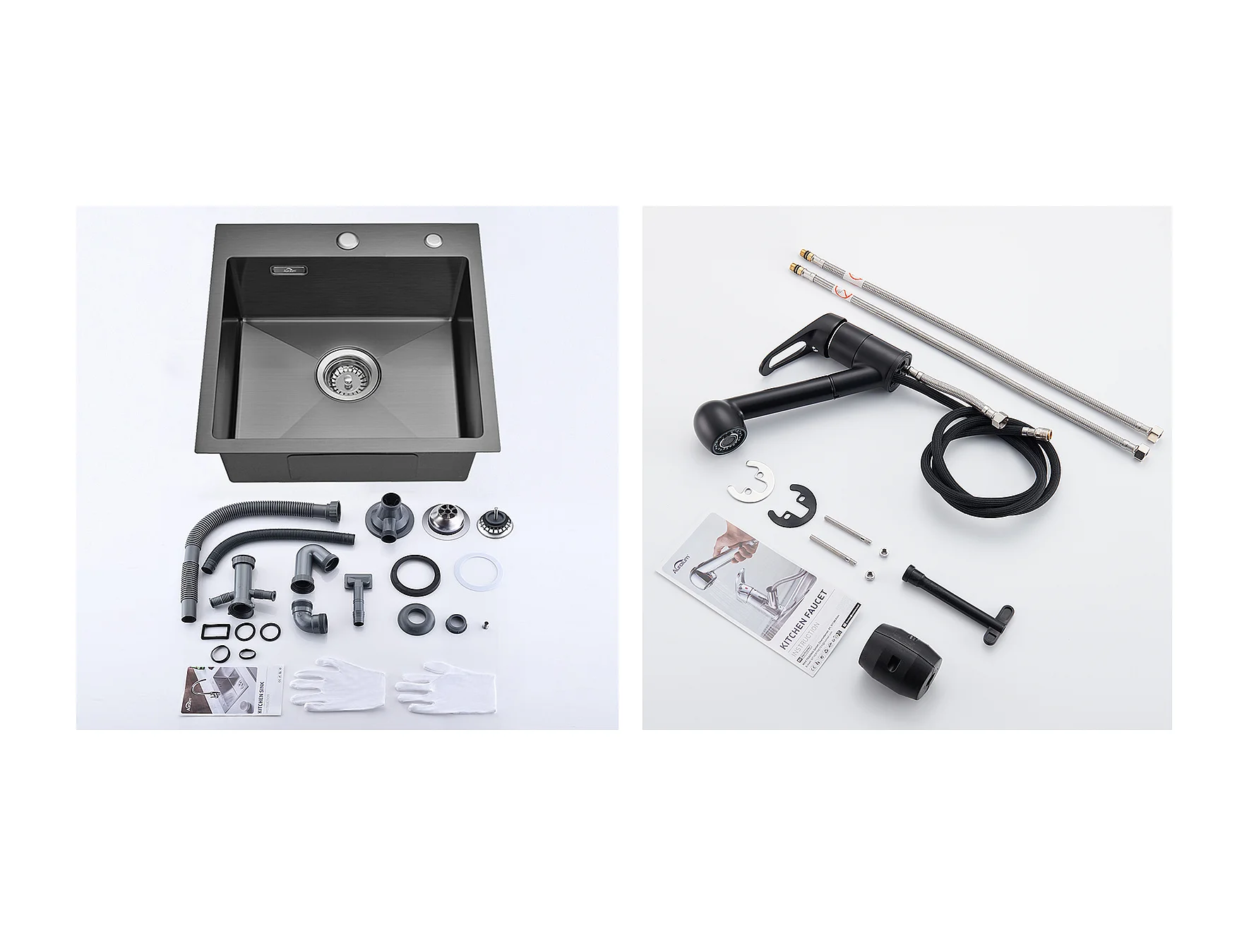 Évier Cuisine 1 Bac 45x45CM Acier Inoxydable 304,encastré et à Posern+Robinet Cuisine Noir avec Douchette Extractible 2 Jets à 360° en Laiton