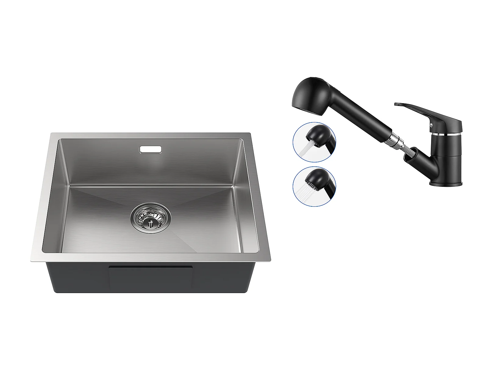 2 en1 Évier de Cuisine 1 Bac 55*44*19CM, à Encastrer/Fleur/ Sous-Plan, Brossé+robinet de cuisine rétractable à deux fonctions, Noir