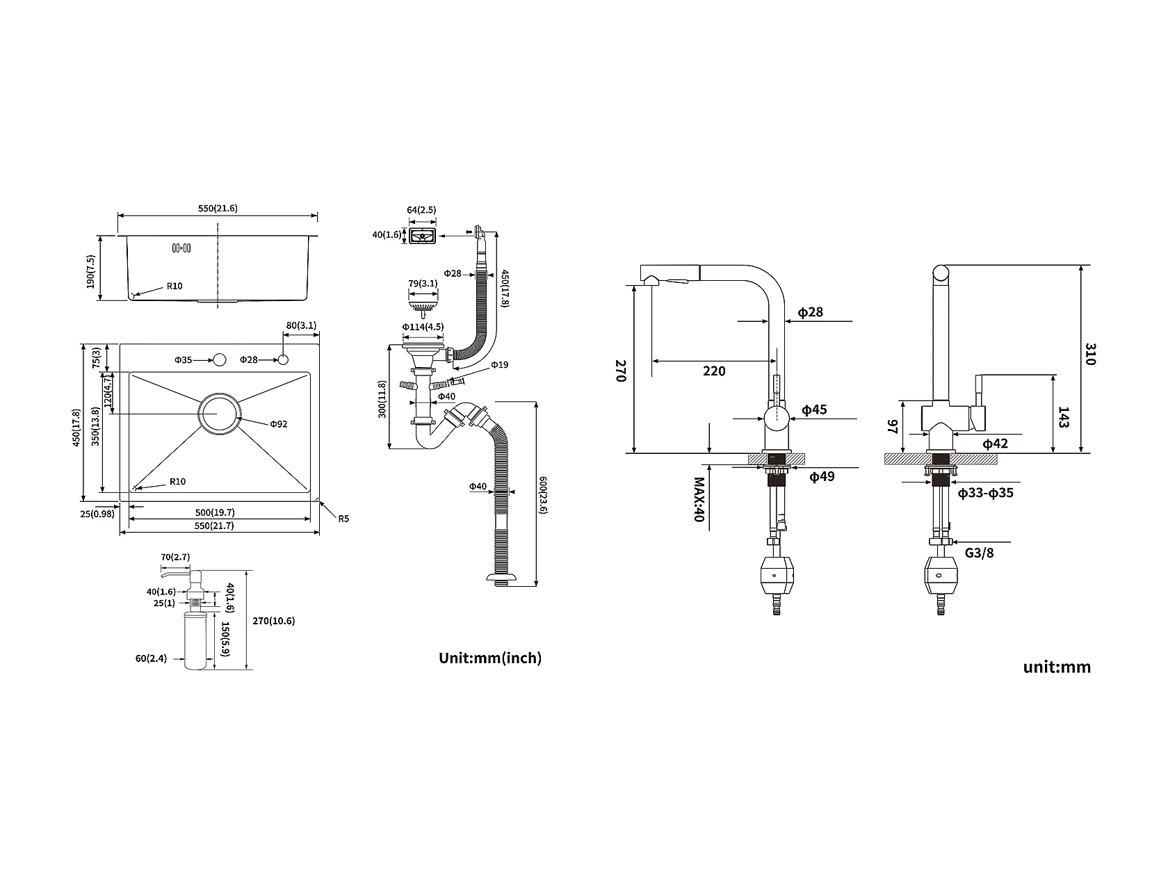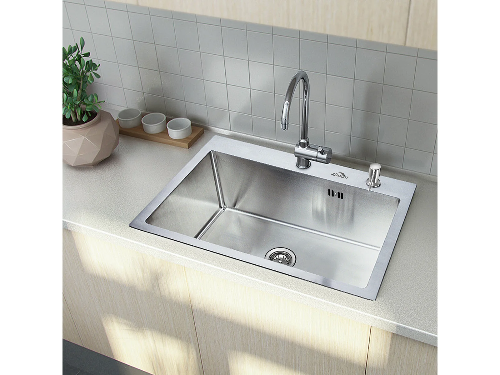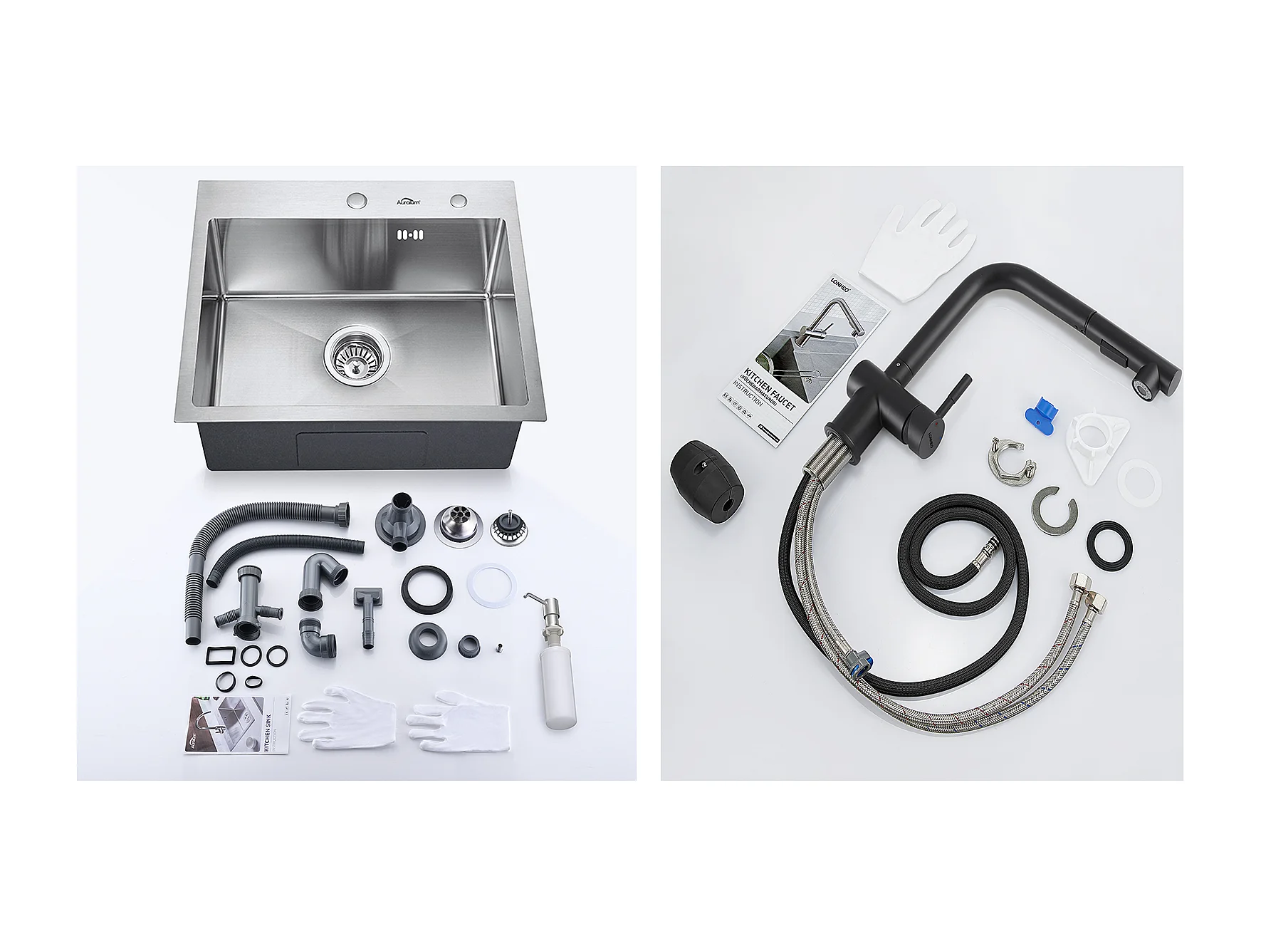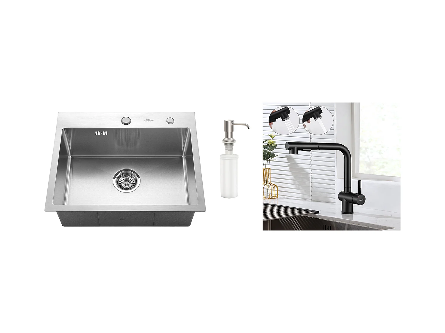 Évier Cuisine 1 Bac 55*45CM Évier Encastré et à Poser avec Distributeur de Savon+Robinet de Cuisine Noir Douchette Extractible à 2 Jets