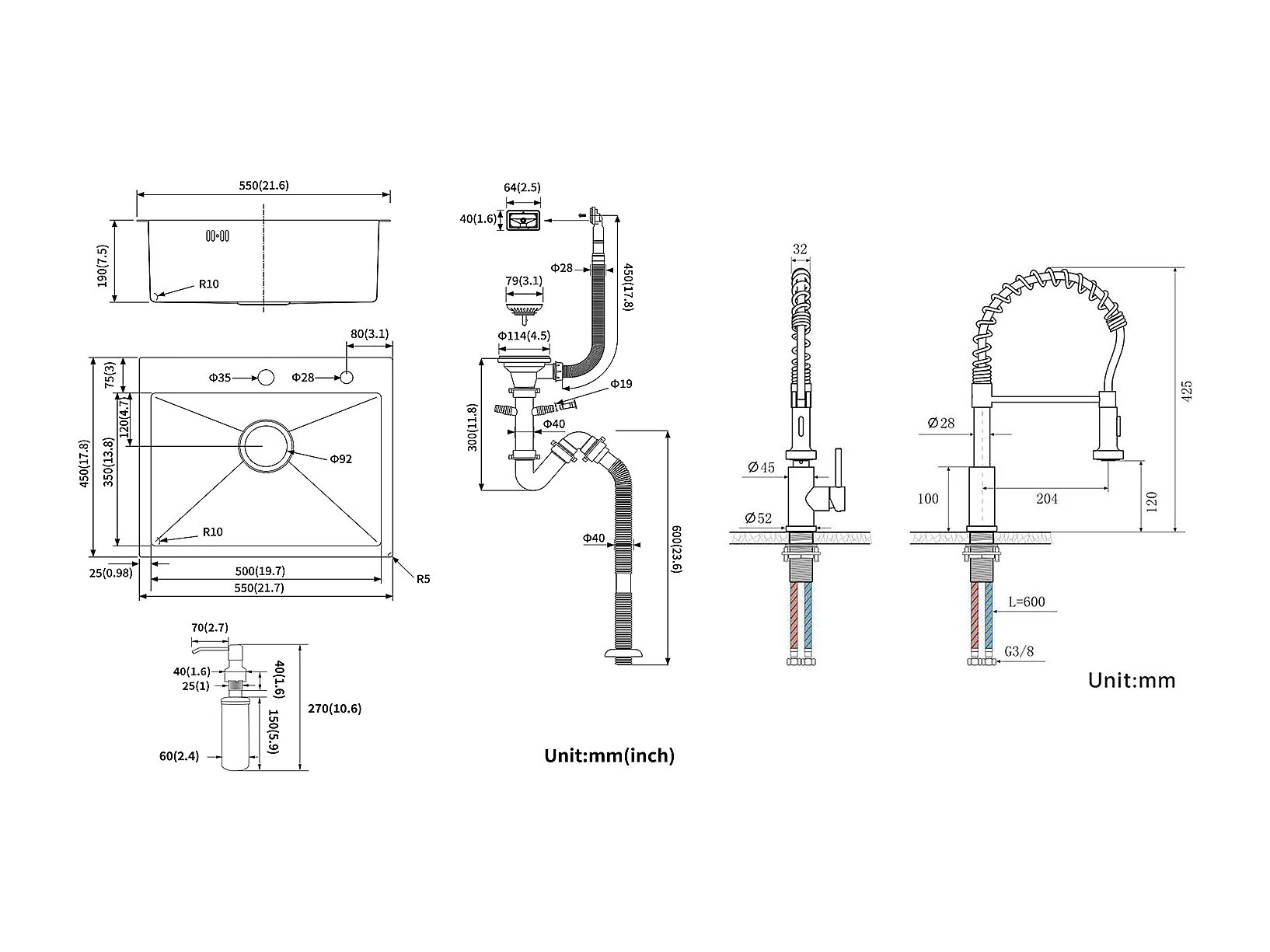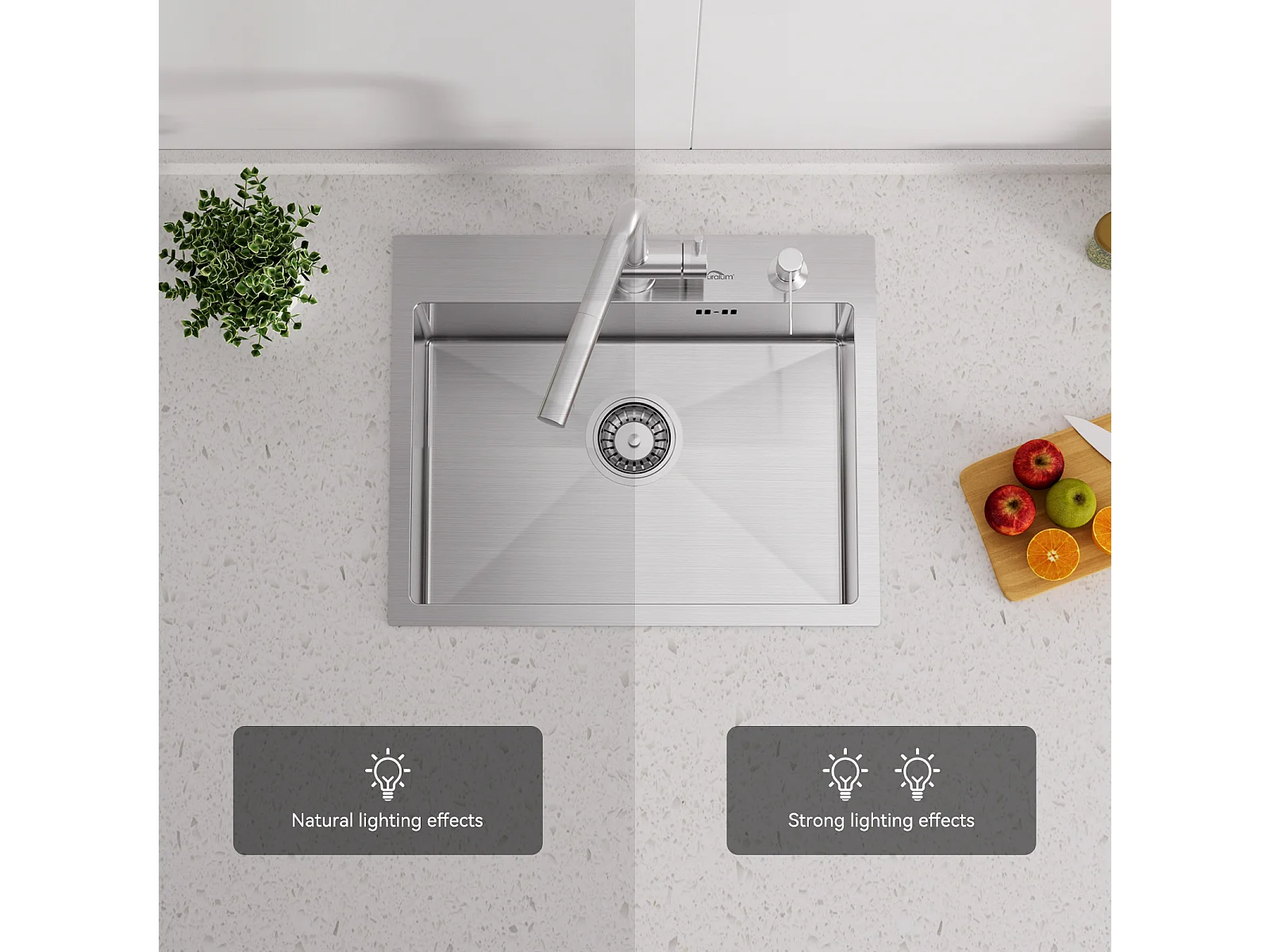 AuraLum Max Évier Cuisine 1 Bac 55*45CM Évier Encastré et à Poser avec Distributeur de Savon+Robinet de cuisine rétractable à deux fonctio,EU Modèle