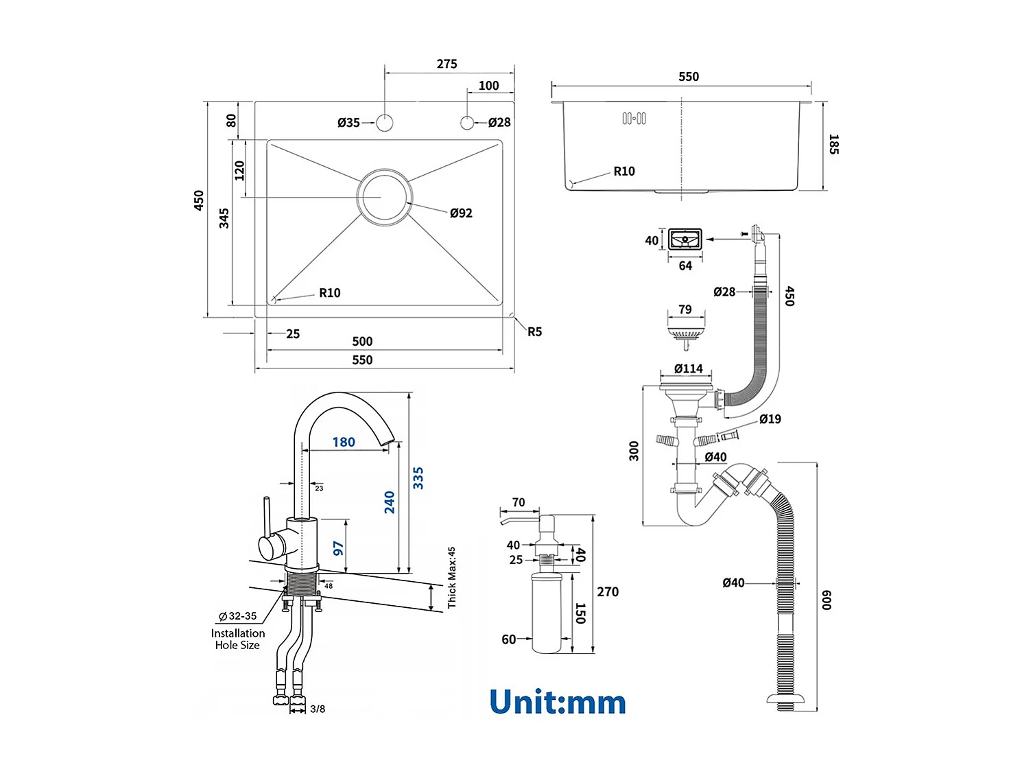 Évier Noir 1 Bac 55*45x18,5CM,Inox,avec Distrubuteur Savon+Robinet Cuisine,Orientable 360°,Eau Chaude/Froide,Noir