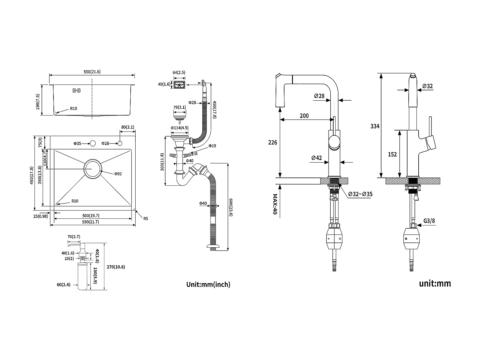 Évier Cuisine 1 Bac 55*45CM Noir +Robinet de Cuisine avec Douchette Extractible Rotatif 360 °,2 Fonctions, Barboteur démontab