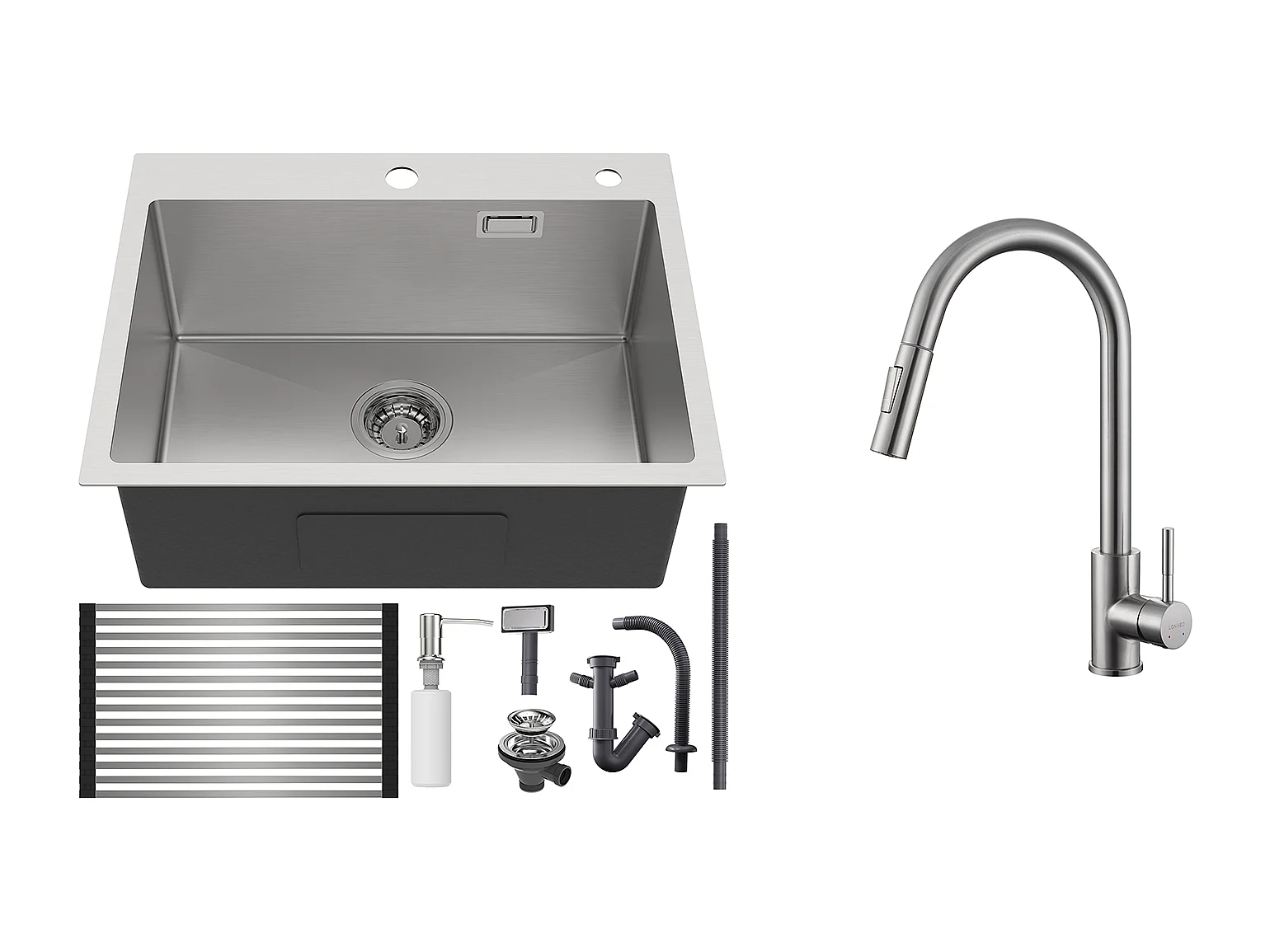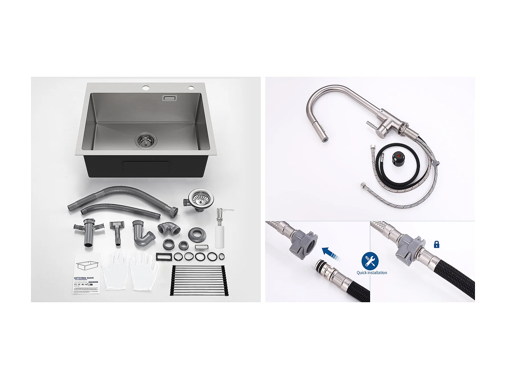Évier Cuisine 1 Bac Brossé,58*45*18CM,Égouttoir Énroulable,Distributeur Savon+Robinet de Cuisine Flexible Bec Haut Orientable