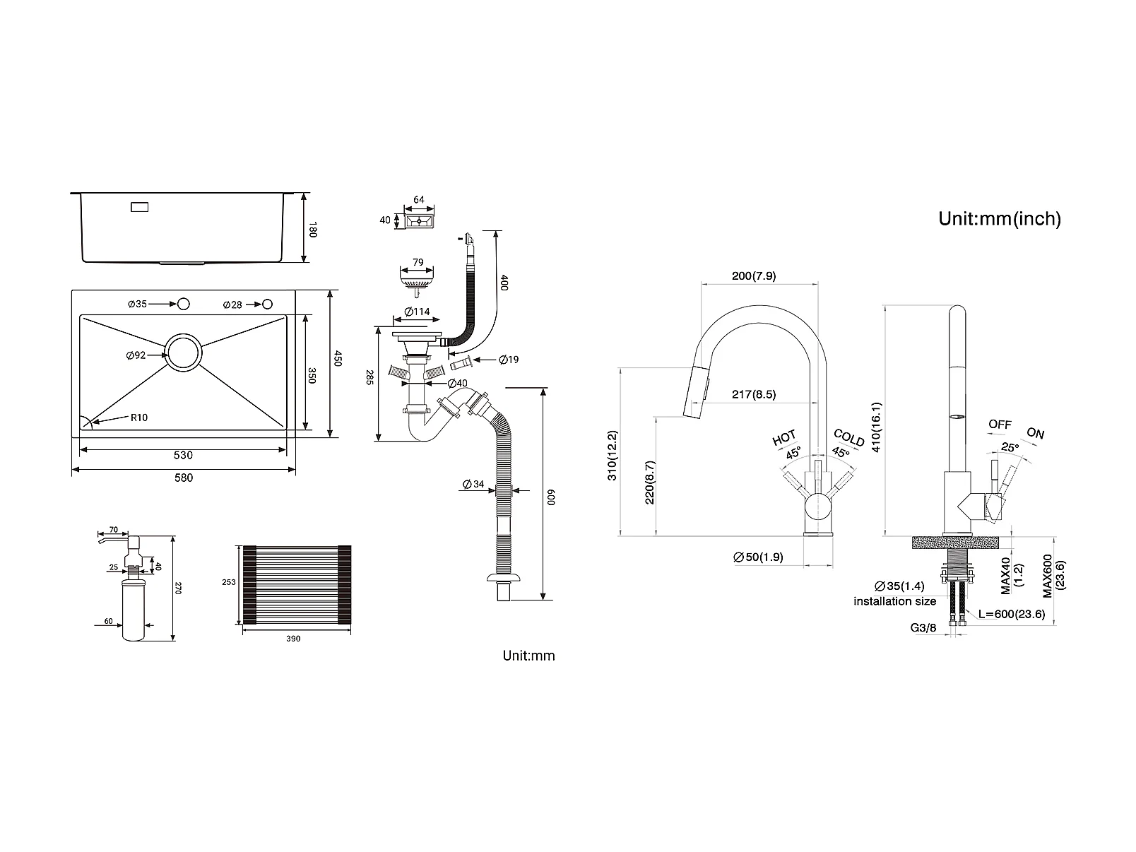 Évier Cuisine 1 Bac Brossé,58*45*18CM,Égouttoir Énroulable,Distributeur Savon+Robinet Cuisine Douchette Extractible Deux Jets Pivotant 360°