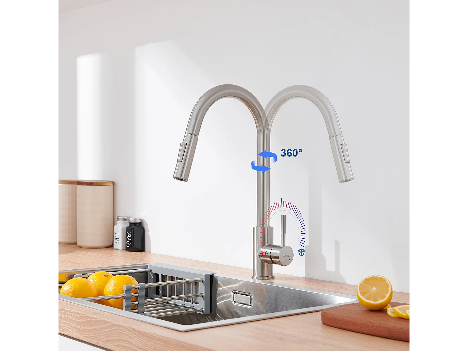 Robinet de cuisine extractible NETTLIFE - Mitigeur d'évier 360° avec douchette en acier inoxydable, 2 modes de pulvérisation