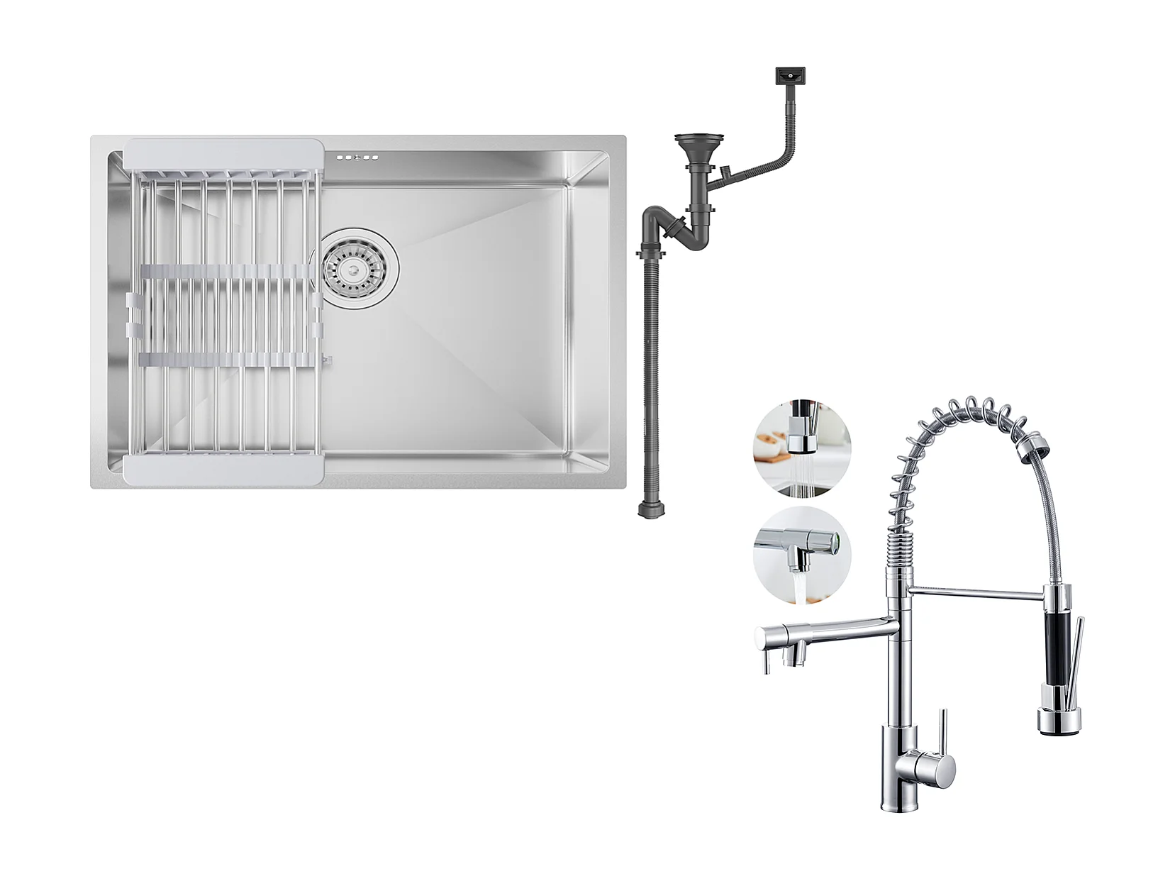 Évier Cuisine 1 Bac 60*44*20CM,inox,à Encastrer/sous-plan avec Panier Drainage,Silver+Robinet Cuisine avec Douchette Extractible 2 Fonctions,Chromé