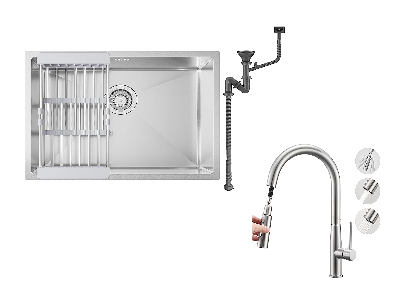 Évier Cuisine 1 Bac 60*44*20CM,inox,à Encastrer/sous-plan avec Panier Drainage,Silver+Robinet Cuisine avec Douchette Extractible,2 Modes Jets,Brossé