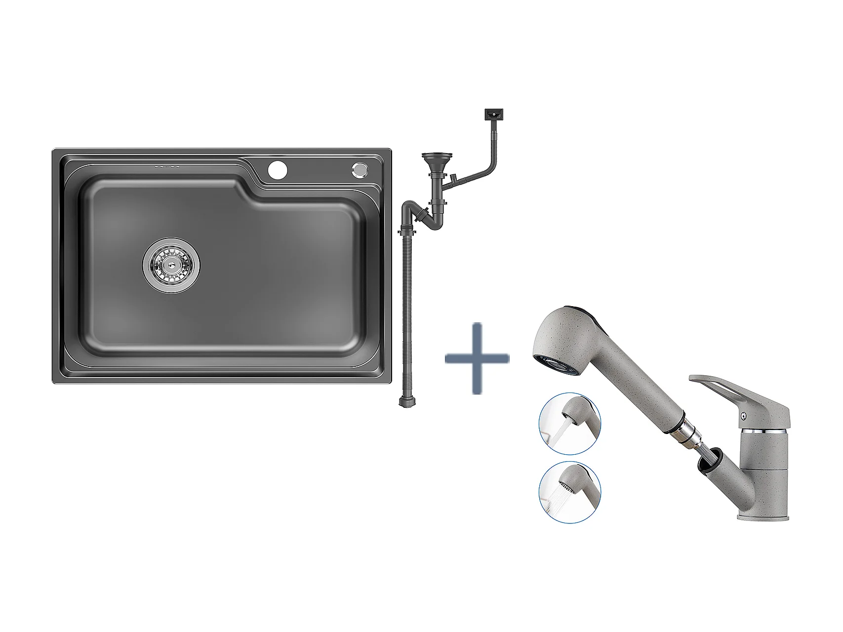 Évier Cuisine 1 Bac 62*45*21CM,en Inox PVD Nano Vasque à Poser,Noir+Robinet Cuisine avec Douchette Extractible 2 Jets,Eau Froide/Chaude,Gris