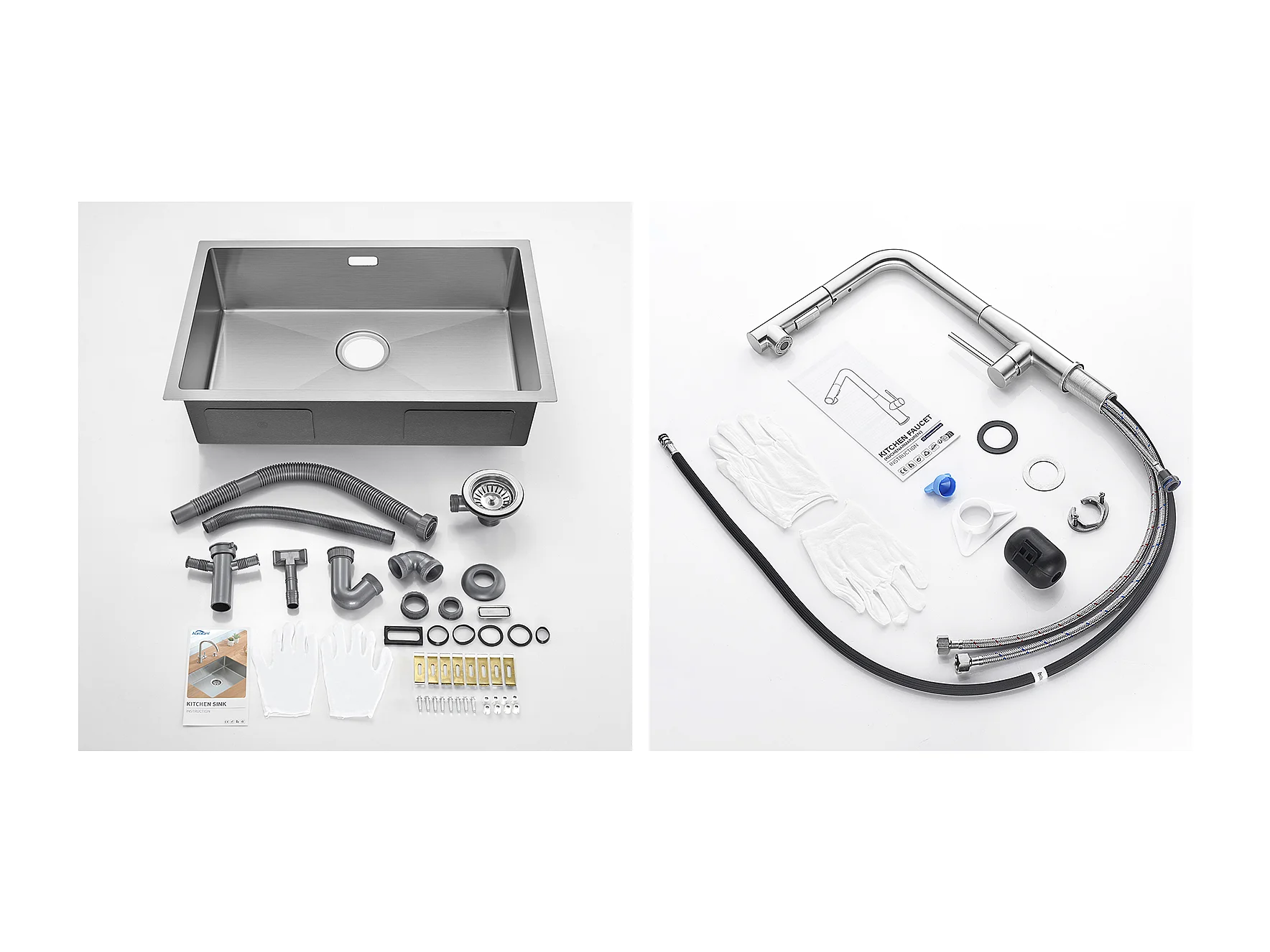 Évier de cuisine Brossé 70*44*19cm inox,sur le plan de travail, encastré ou sous-plan +robinet de cuisine rétractable à deux fonctions, Noir