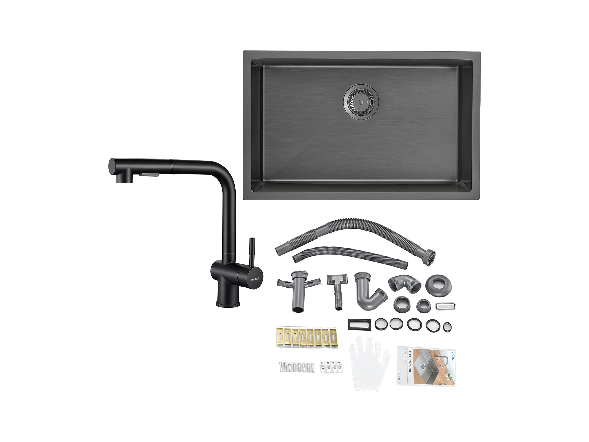Évier Cuisine 1 Bac 70*44*19CM+Robinet de Cuisine avec Douchette Extractible Rotatif 360 °2 Fonctions, Barboteur démontable,Noir