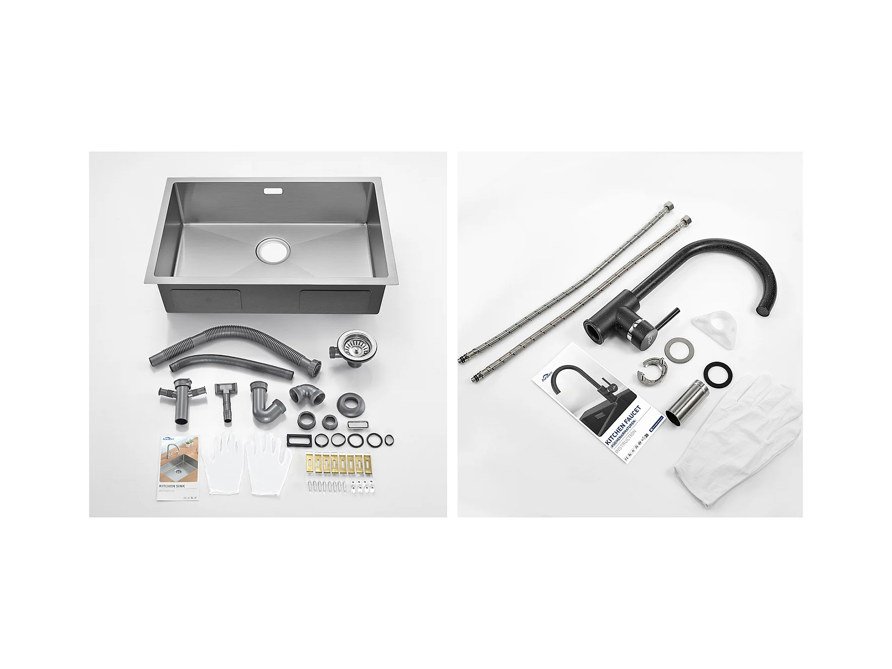 Évier Cuisine 1 Bac70*44*19CM,à Encastrer/Fleur/Sous-Plan,avec Siphon/Trop-Plein,Brossé+Robinet Cuisine Flexible Bec Haut Orientable Librement,Blanc