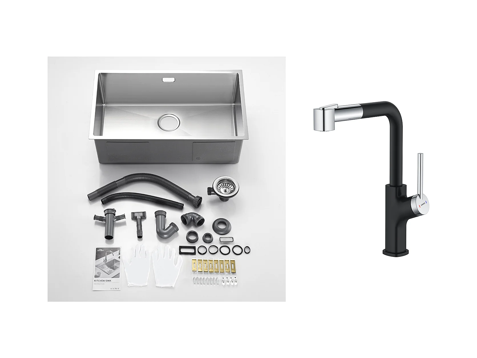 Évier Cuisine 1 Bac 74*44*20CM 304 Inox Évier Brossé avec Siphon et Trop-Plein +robinet de cuisine rétractable à deux fonctions, Noir