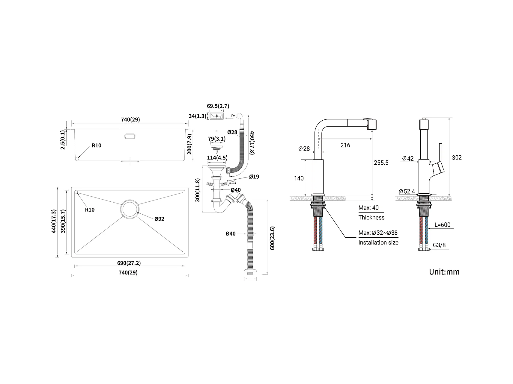 Lonheo Max Évier Cuisine 1 Bac 74*44*20CM Évier Brossé Montage à Encastrer/Fleur/Sous-Plan en Acier Inoxydable 304 avec Système de Drainage,EU Modèle