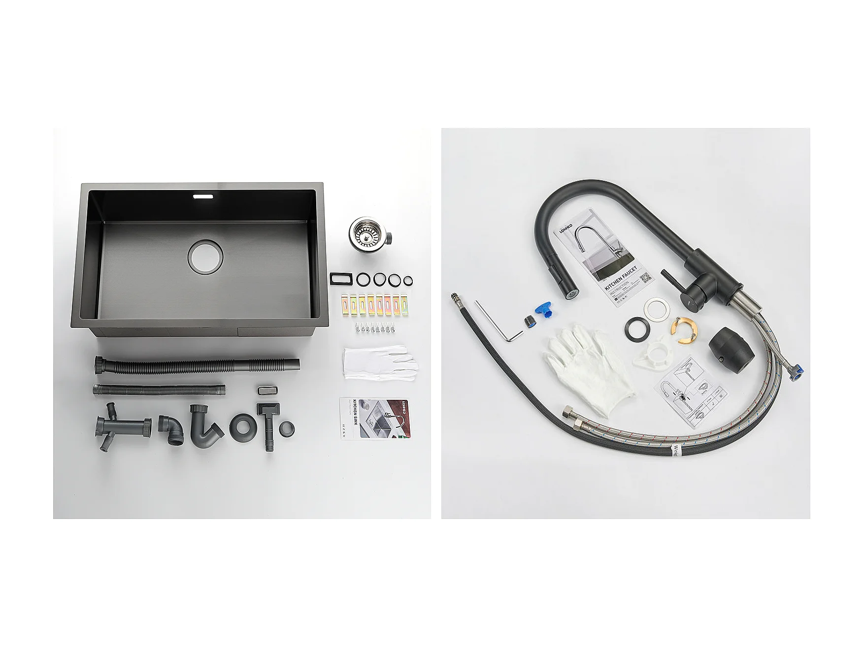 Évier Cuisine 1 Bac 74*44*20CM,en Inox Brossé avec Siphon et Trop-Plein+robinet de cuisine rétractable à deux fonctions, Noir