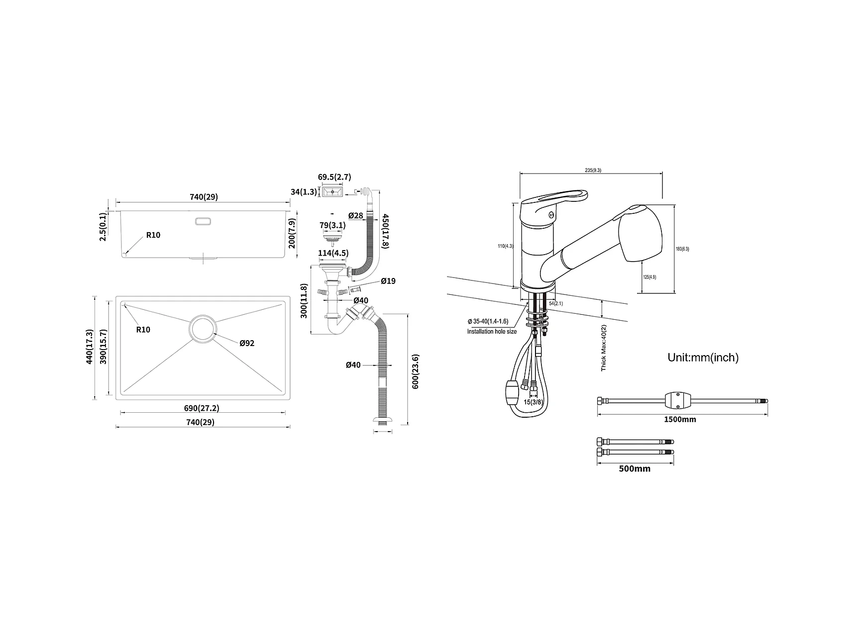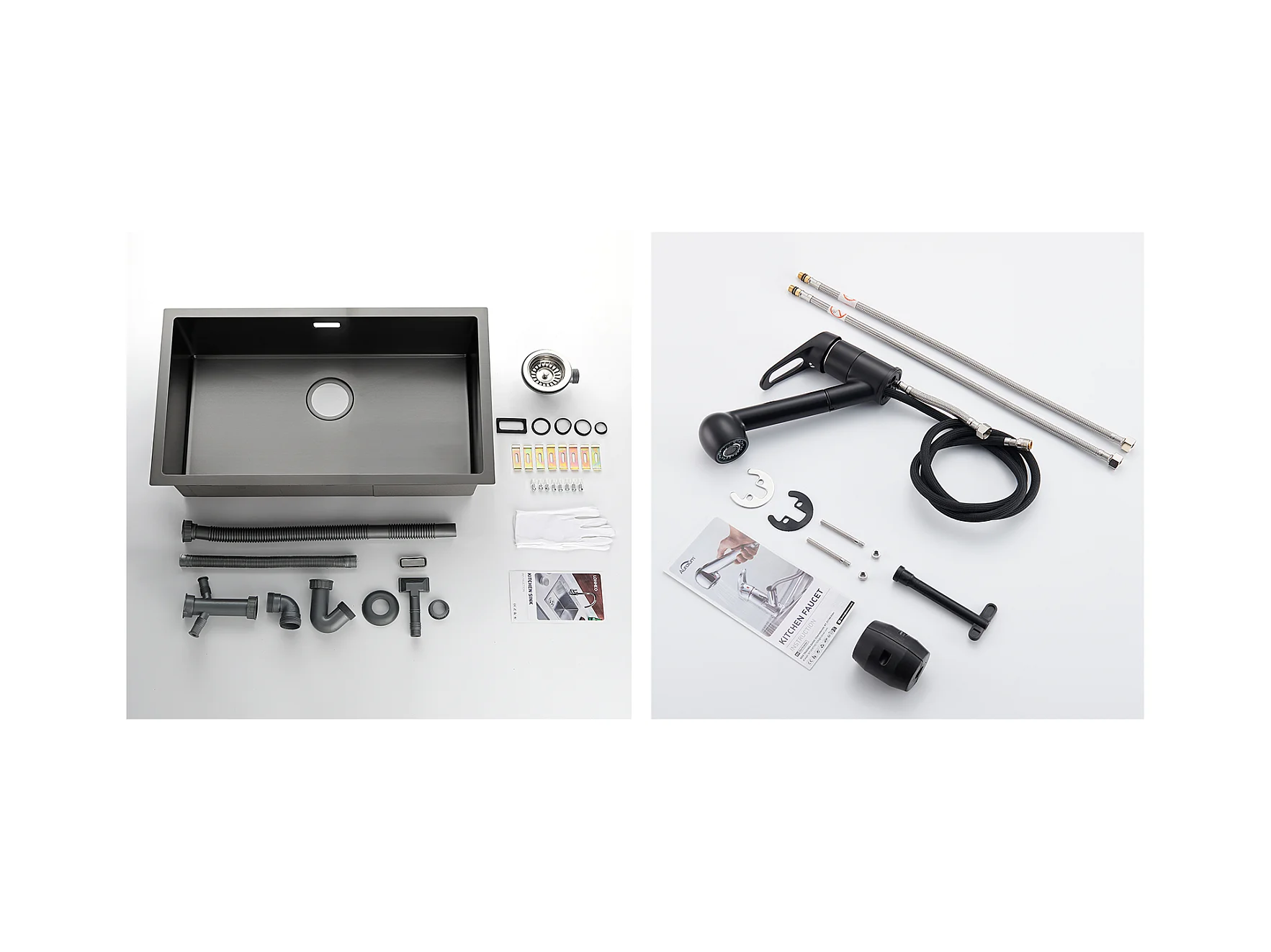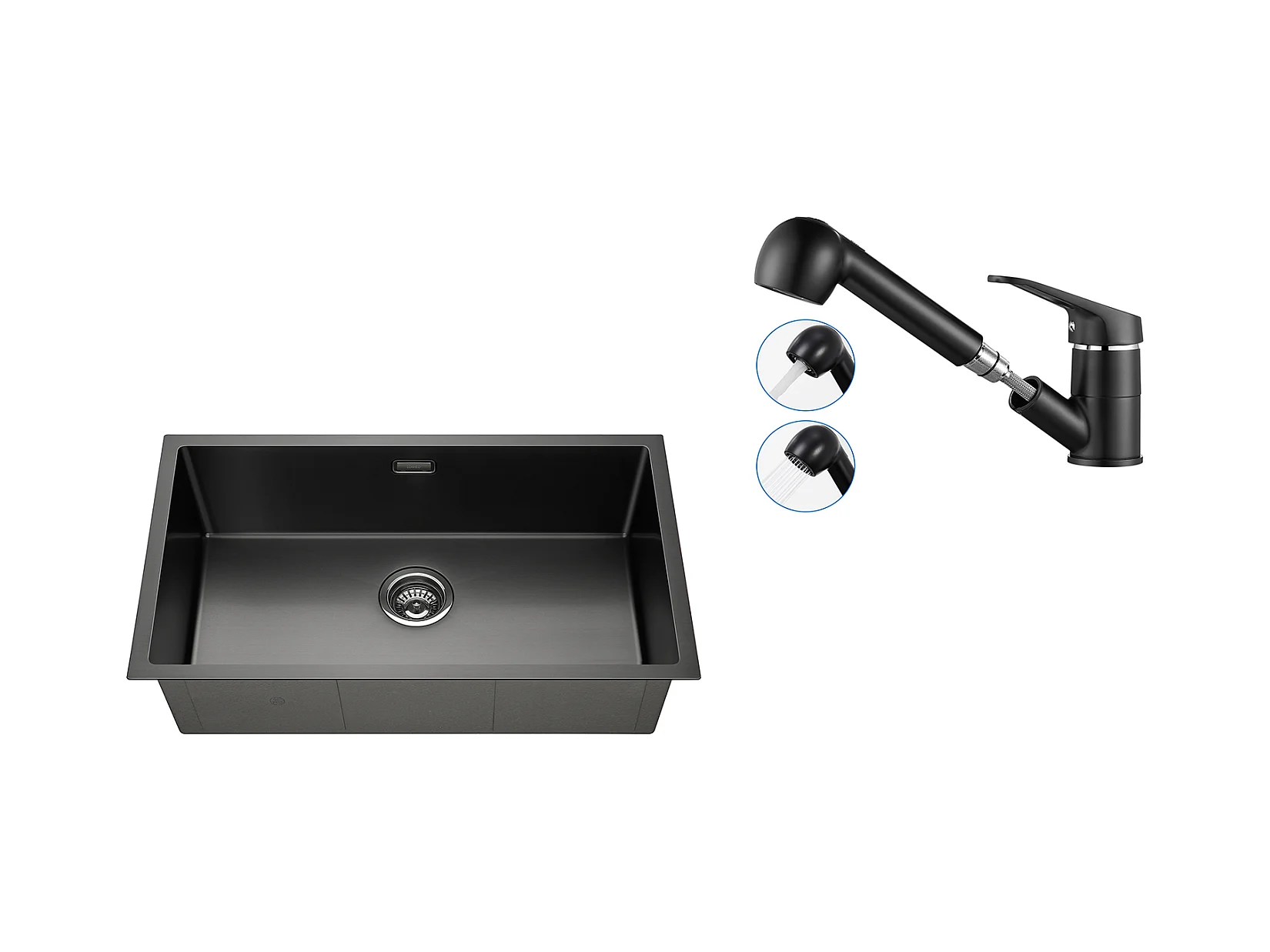 Évier Cuisine 1 Bac 74*44*20CM,en Inox Brossé avec Siphon et Trop-Plein+robinet de cuisine rétractable à deux fonctions, Noir