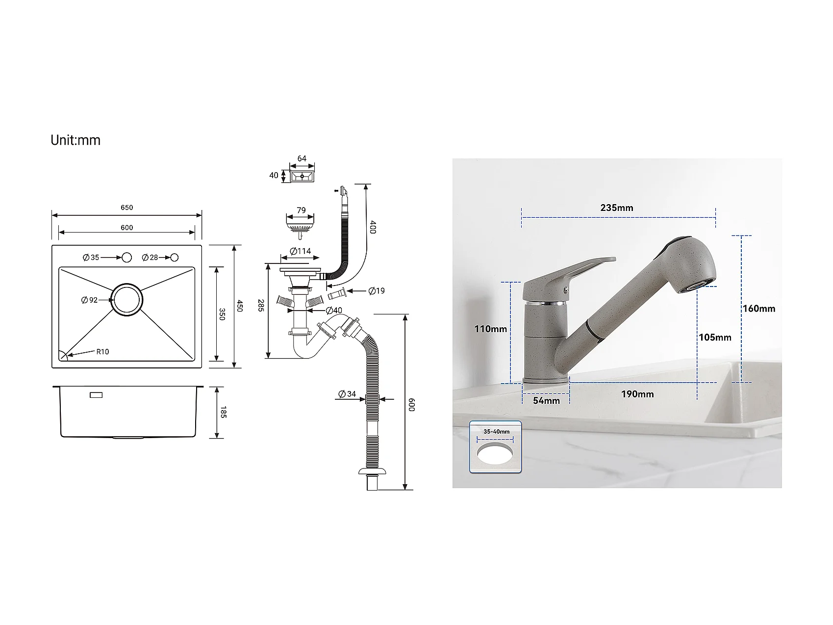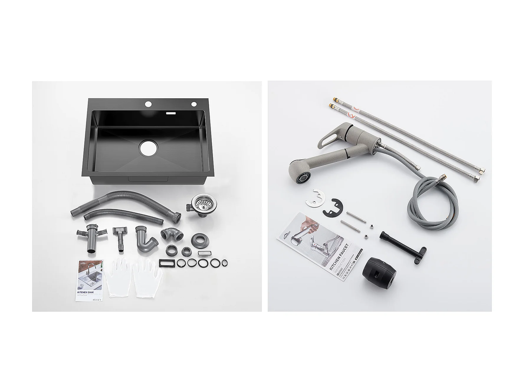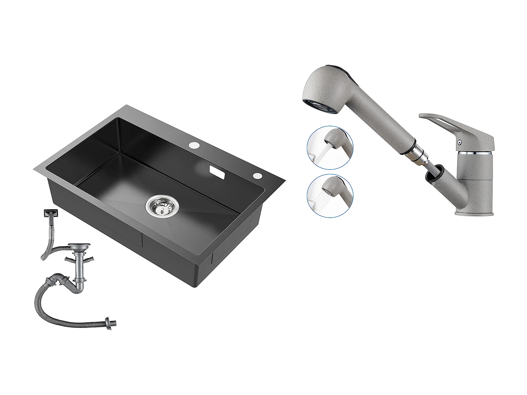 Évier Cuisine 1 Bac Acier Inoxydable Noir 65x45CM,encastré/à Poser+Robinet Cuisine avec Douchette Extractible 2 Jets,Eau Froide et Chaude,Gris