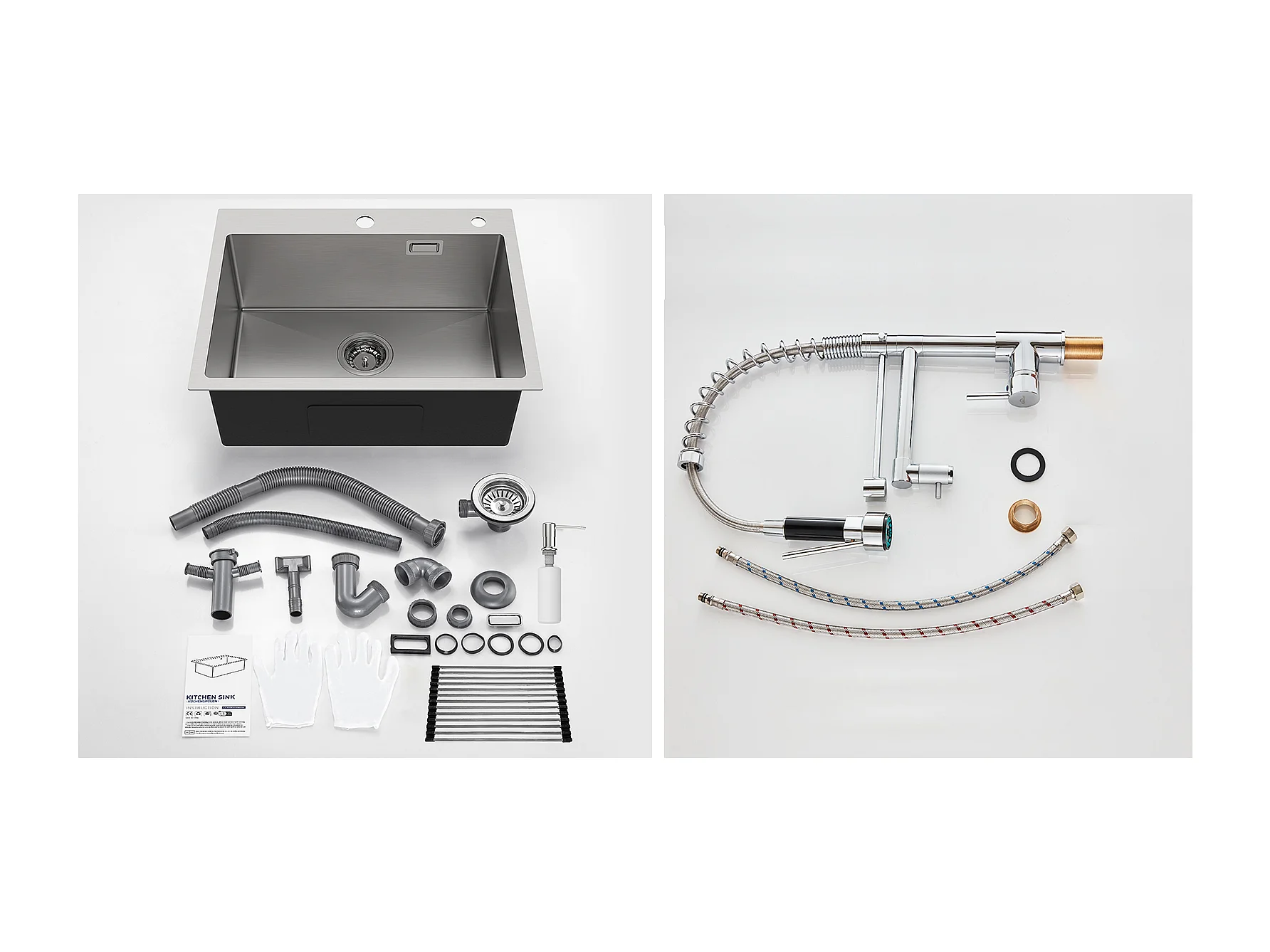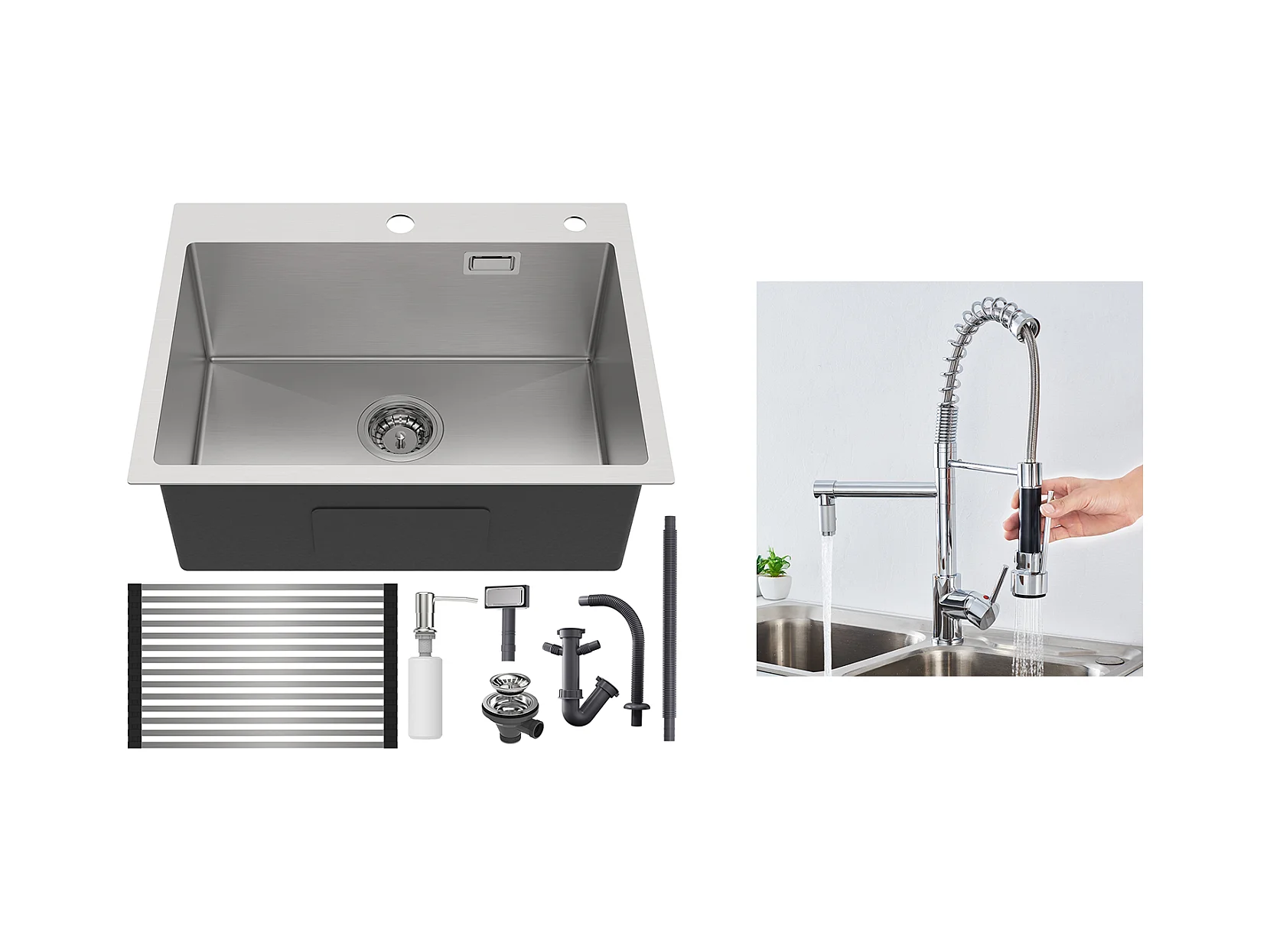 Évier Cuisine 1 Bac Brossé,58*45*18CM,Égouttoir Énroulable,Distributeur Savon+Robinet de Cuisine Flexible Bec Haut Orientable