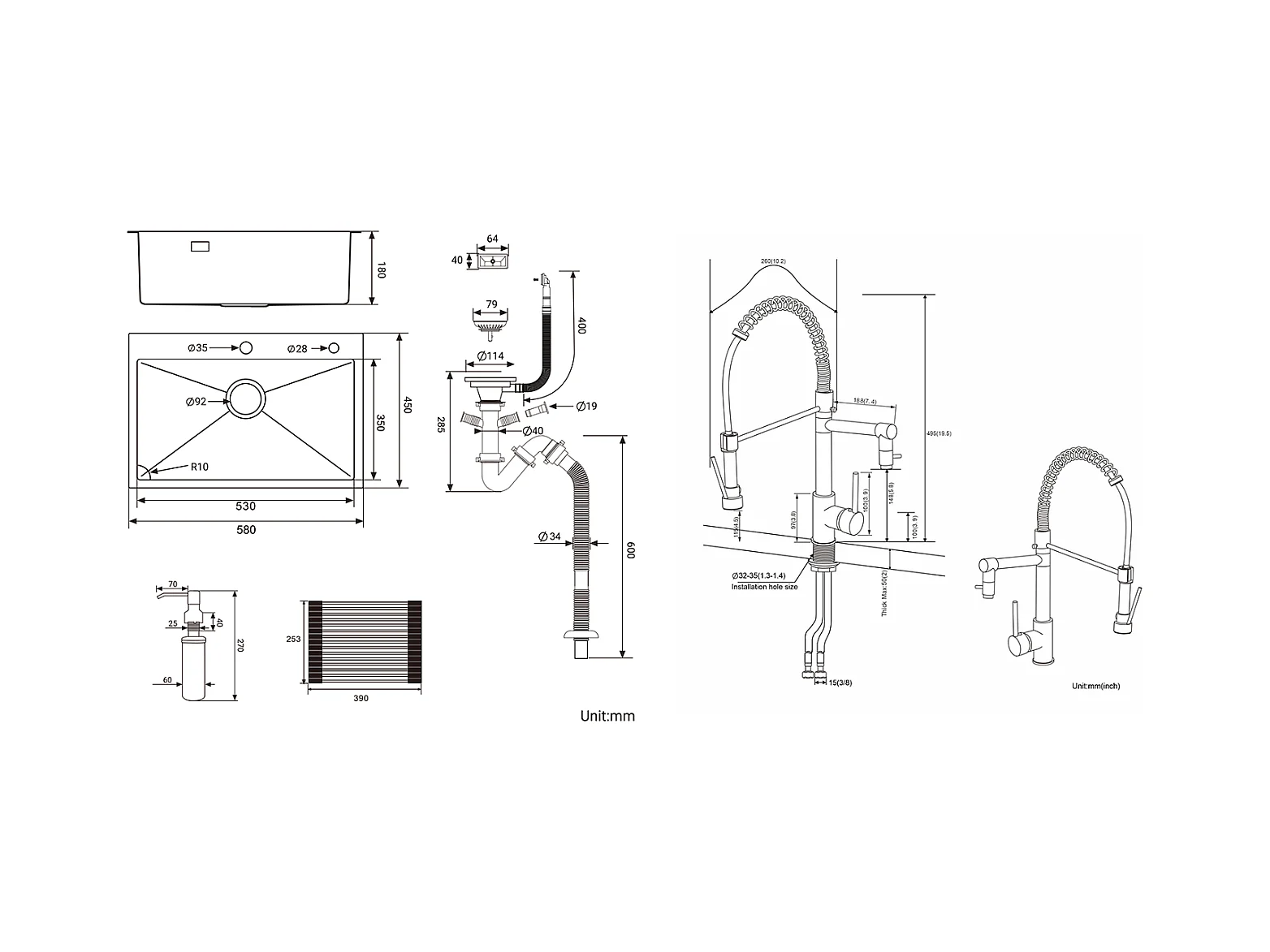 Évier Cuisine 1 Bac 58*45*18CM,Égouttoir Énroulable, Distributeur Savon+Robinet Cuisine à Ressort avec Douchette Extensible,2 Modes,Brossé