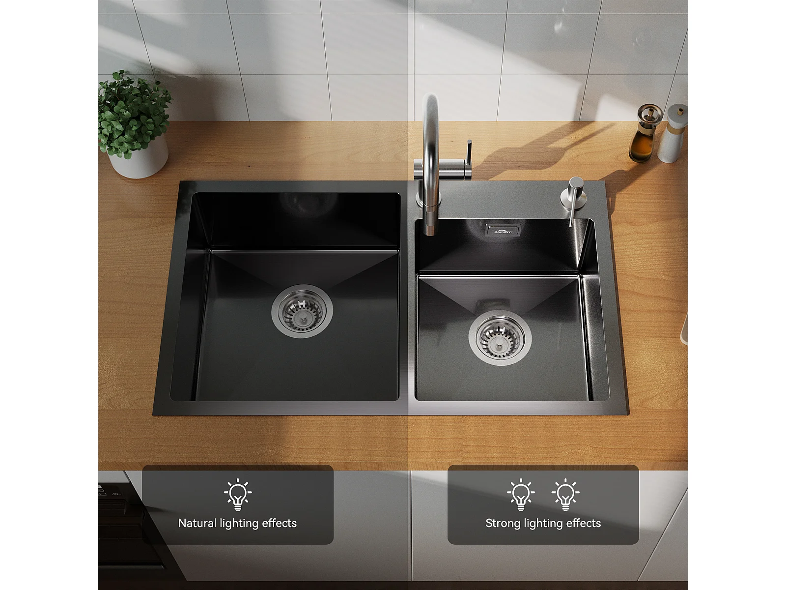 2en1 Évier Cuisine 2 Bacs,Noir,75x45x19cm,Encastré/à Poser avec Distributeur Savon+Robinet Cuisine Flexible Bec Haut Orientable Librement