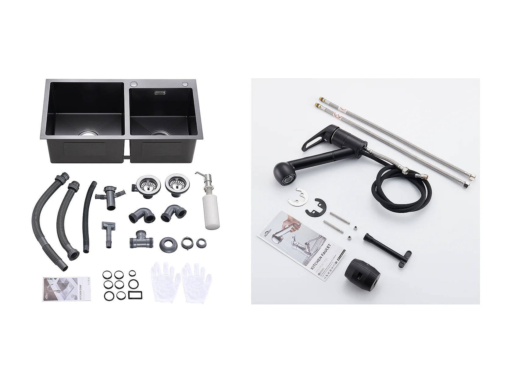 2 en 1 Évier de Cuisine 2 Bac ,Noir,75x45x19cm,Encastré/ à Poser avec Distributeur de Savon+Robinet de Cuisine Flexible Bec Haut Orientable
