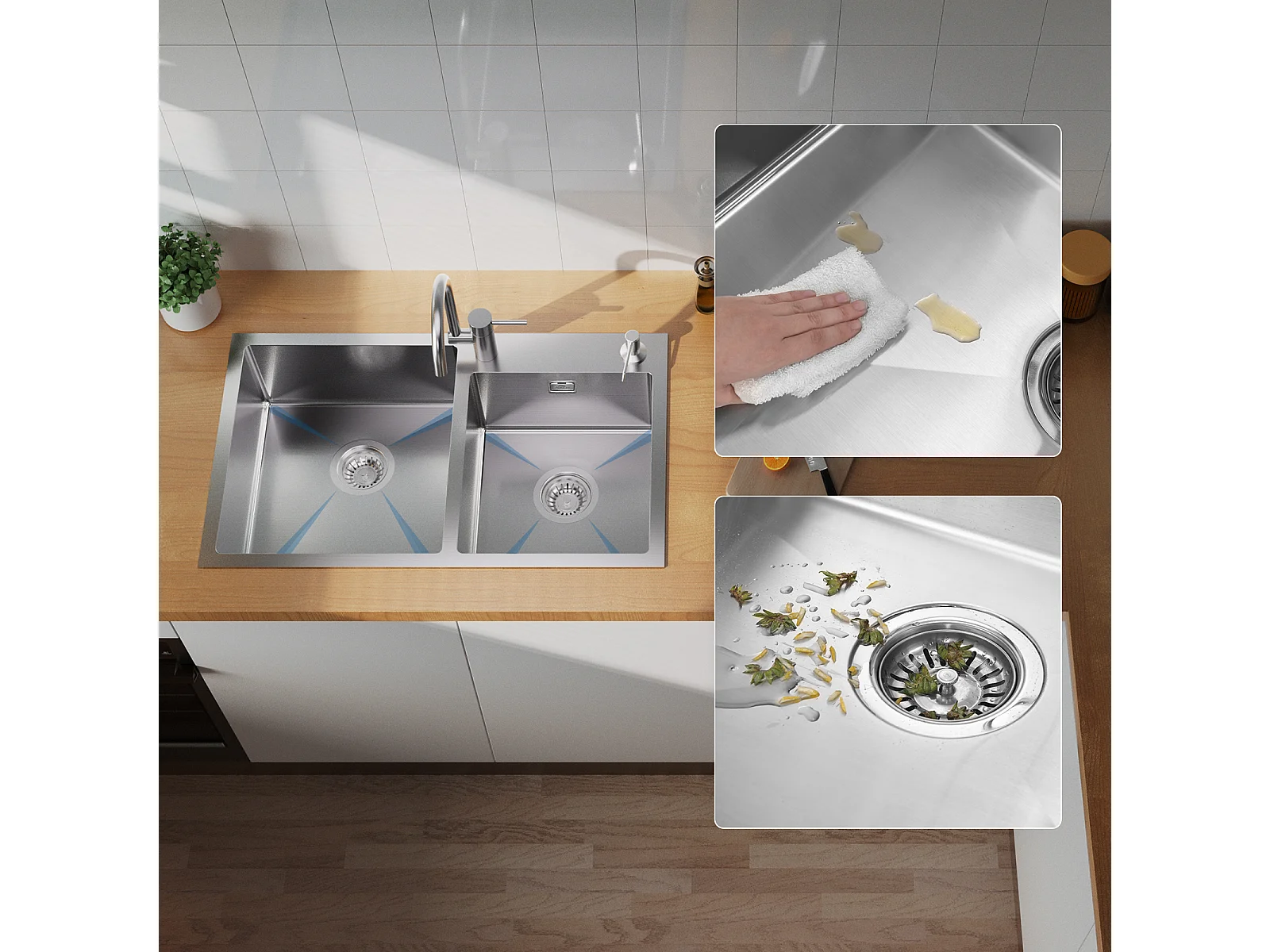 2 en 1 Évier Cuisine 2 Bacs ,Noir,75x45x19cm,Encastré/ à Poser avec Distributeur Savon+Robinet Cuisine Rotatif 360°,Blanc avec points noirs