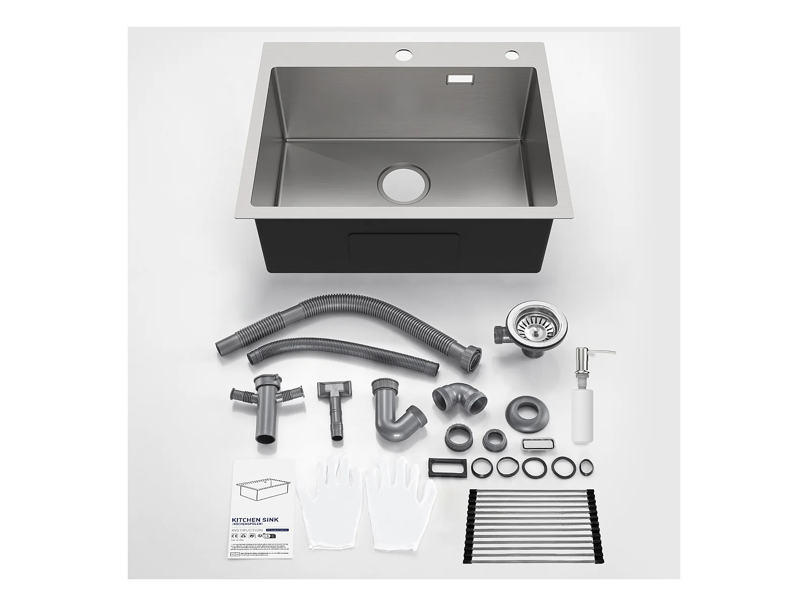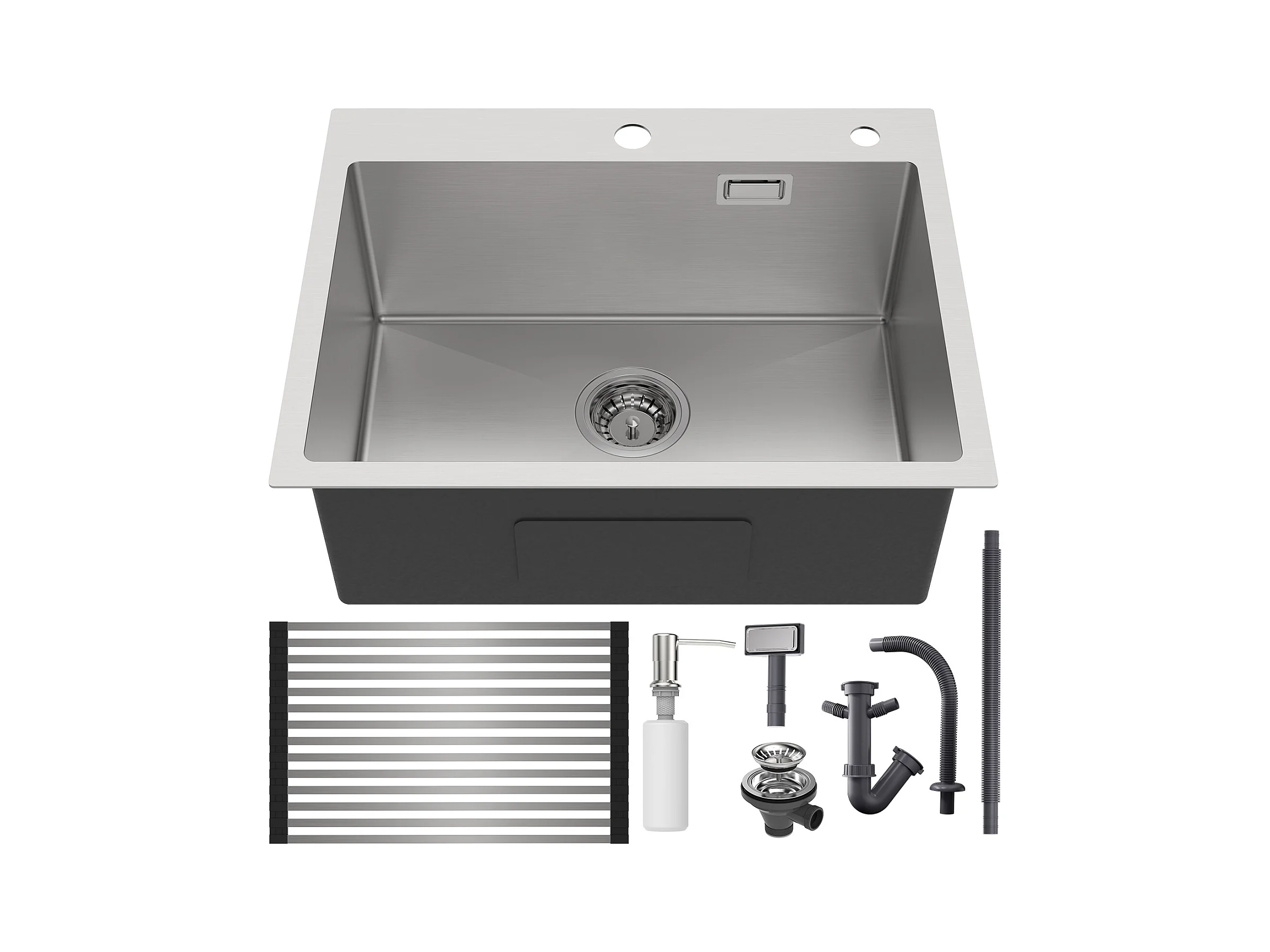 Évier Cuisine 1 Bac Brossé,58*45*18CM,Égouttoir Énroulable,Distributeur Savon+Robinet de Cuisine Flexible Bec Haut Orientable