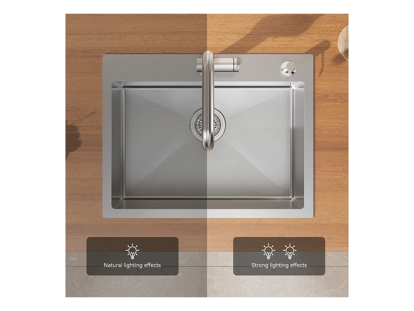 AuraLum Max Évier Cuisine 1 Bac Brossé,58*45*18CM,Égouttoir Énroulable,Distributeur Savon+Mitigeur Cuisine Rabattable,Eau froid Chaud,EU Modèle