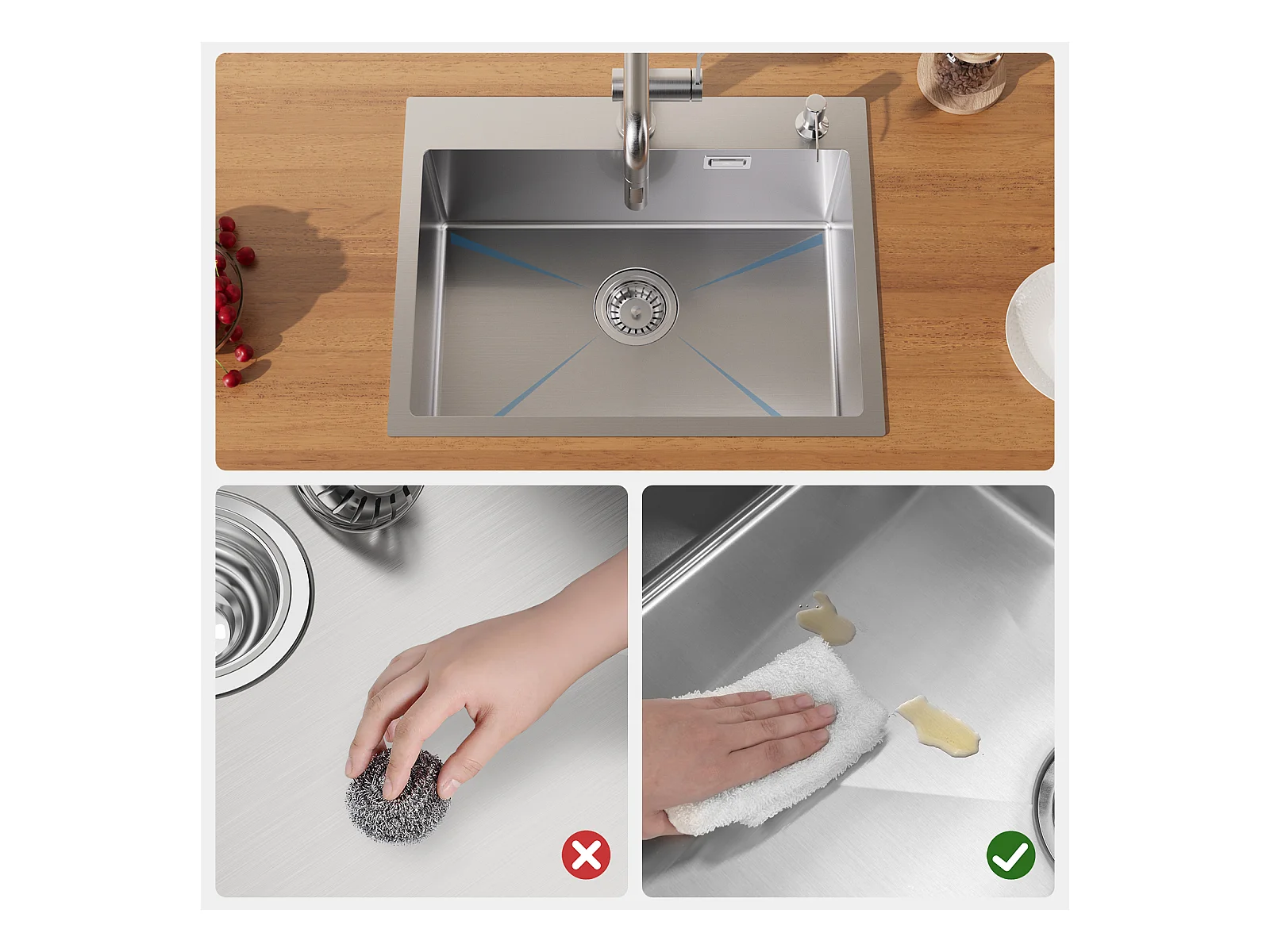 Évier Cuisine 58*45*18CM, Lavabo Cuisine 1 Bac avec Égouttoir Enroulable et Distributeur de Savon, Inox brossé, Montage à Encastrer ou à Fleur