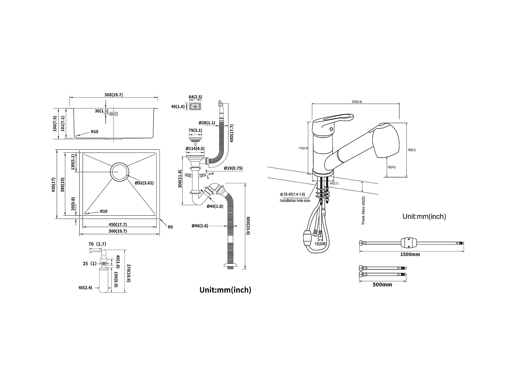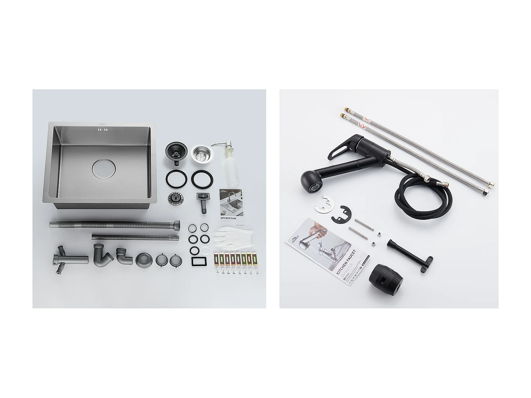 Évier de Cuisine Inox 1 Bac 50*43*18CM avec Distributeur de Savon +robinet de cuisine rétractable à deux fonctions, Noir