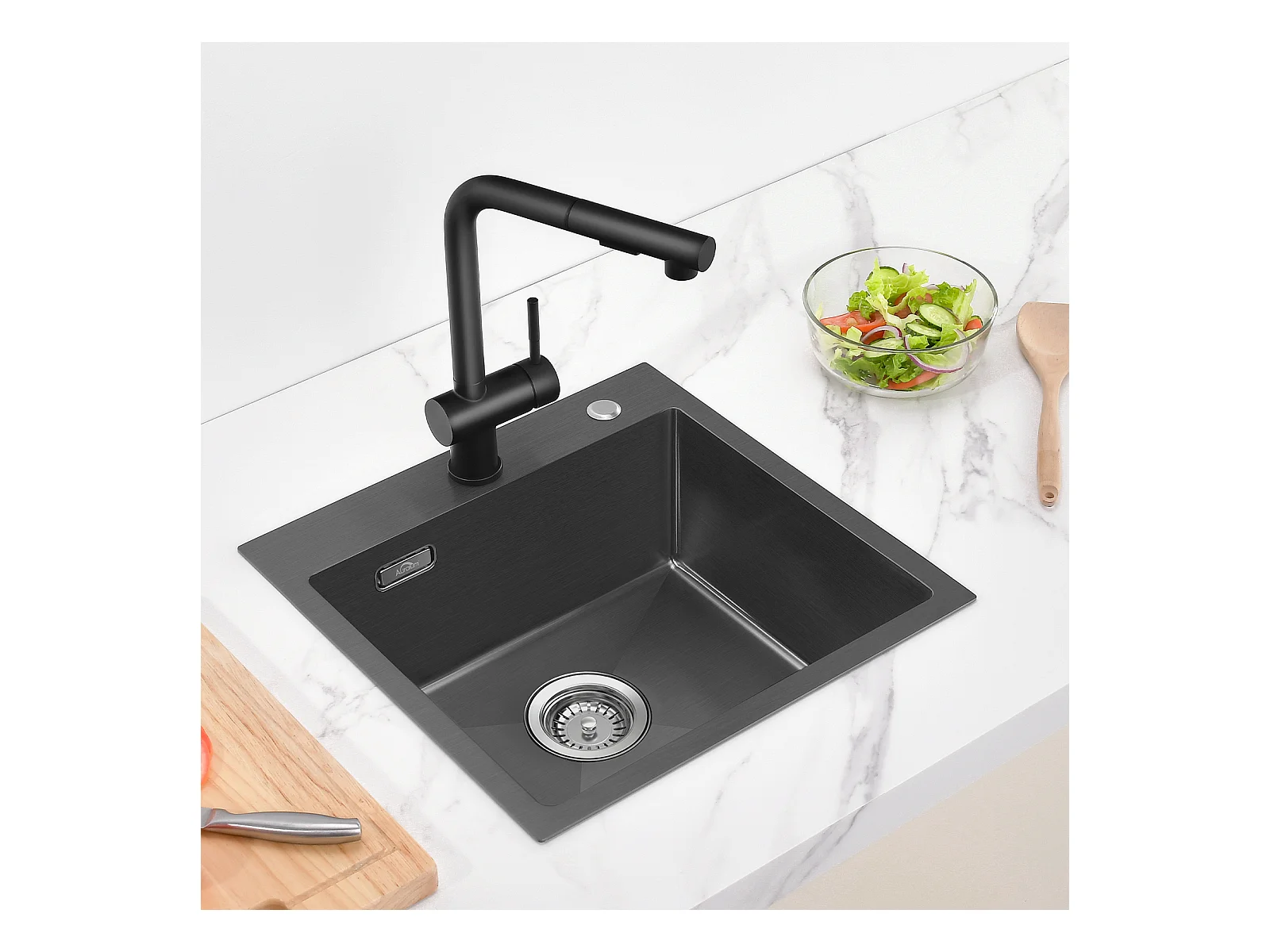 Évier Cuisine Noir 1 Bac 45x45CM Acier Inoxydable 304 ,encastré et à Poser+ Robinet de Cuisine Inox Extractible Rotatif à 360 °