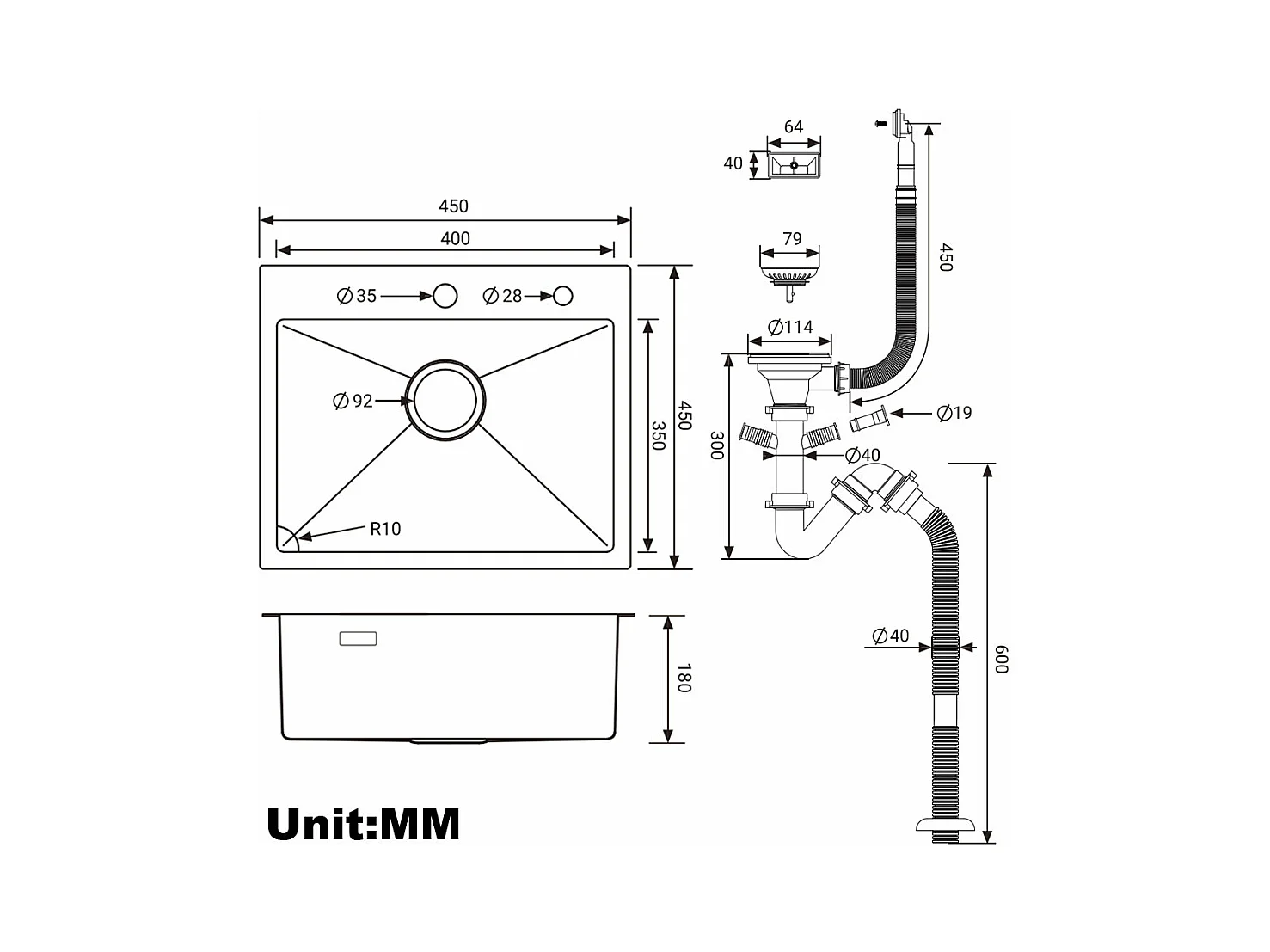 Évier Cuisine 1 Bac 45x45CM Acier Inoxydable 304 ,encastré et à Poser +robinet de cuisine rétractable à deux fonctions, Noir,EU Modèle