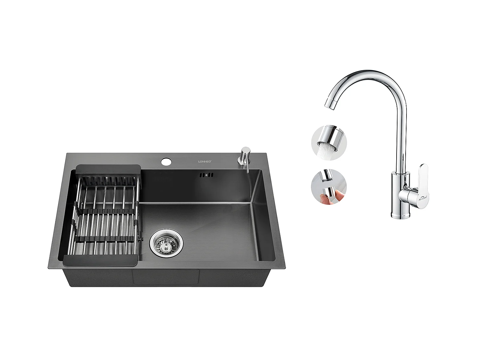 Lonheo Max Évier de Cuisine Noir 68x45x19CM avec Distrubuteur de savon et Égouttoir panier +Mitigeur Cuisine en Acier Inox 304 Rabattable Pivotant
