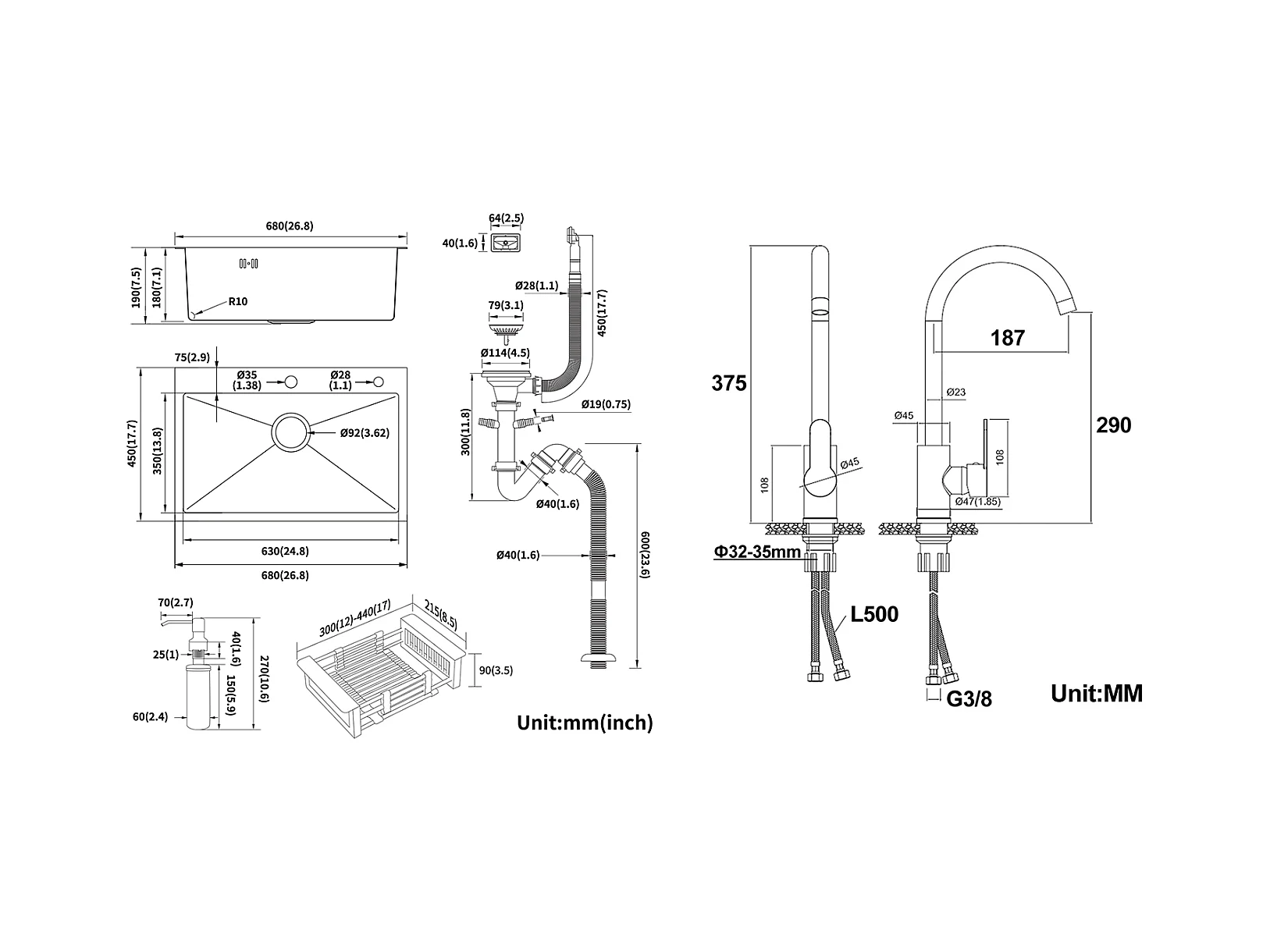 Évier Cuisine 68x45x19CM,Distrubuteur savon/ Égouttoir panier+Robinet Cuisine avec Douchette Extractible,Eau Froide/Chaude,Bec Forme U,Noir