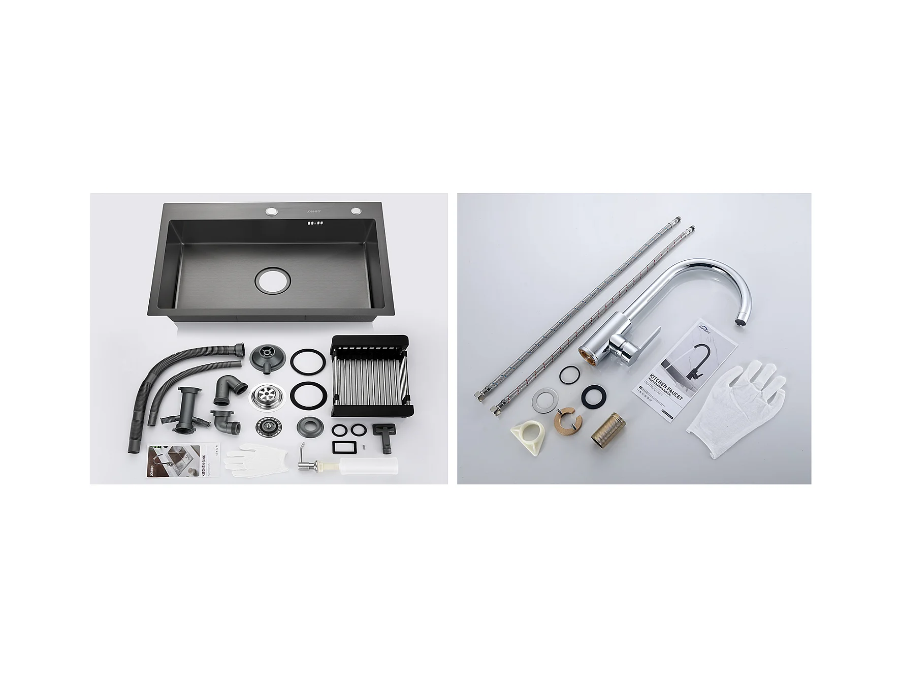 Évier Cuisine Noir 68x45x19CM avec Distrubuteur de savon et Égouttoir panier+Robinet Cuisine Pivotant à 360° avec Eau Chaude/Froide, Chromé