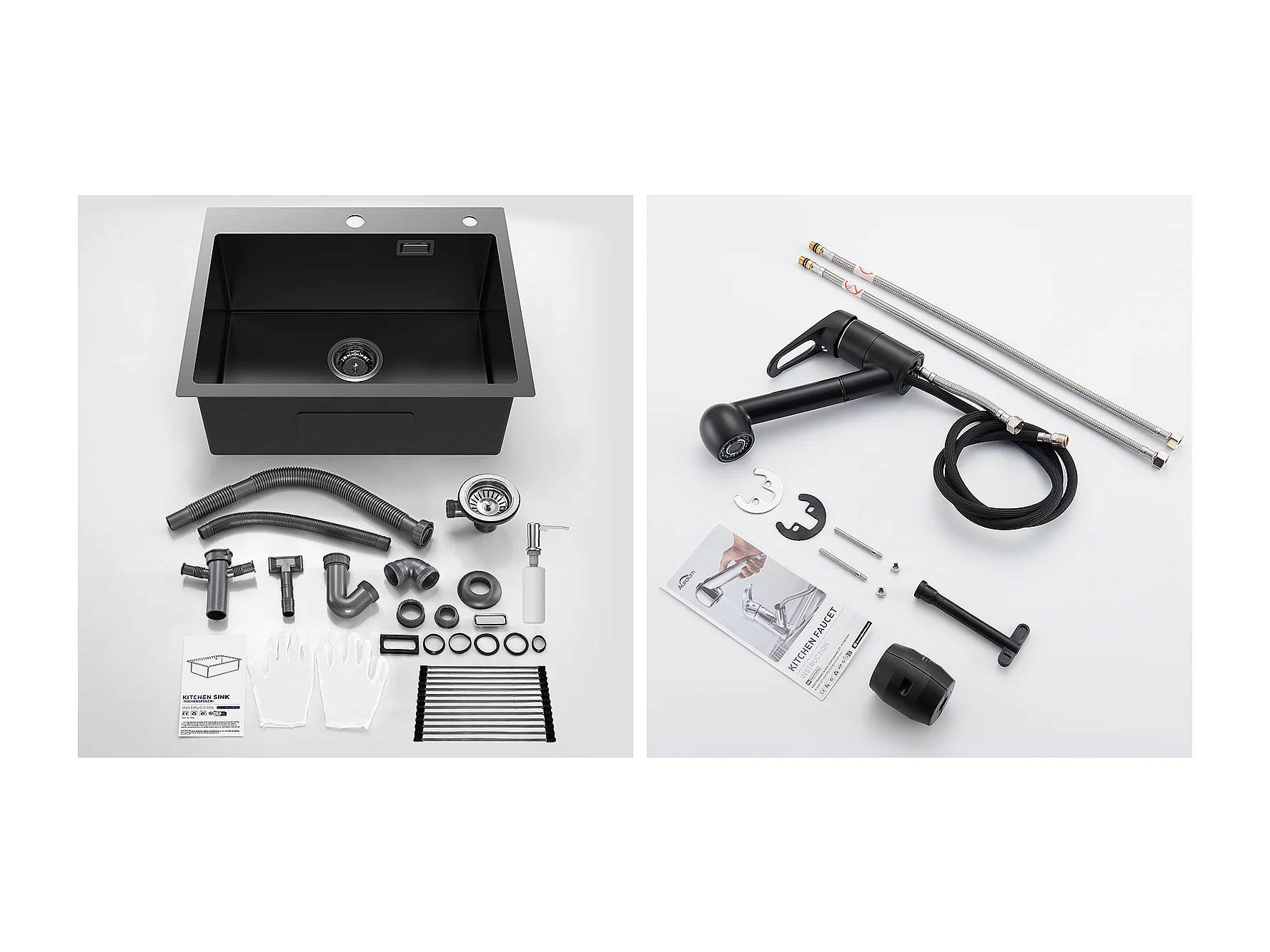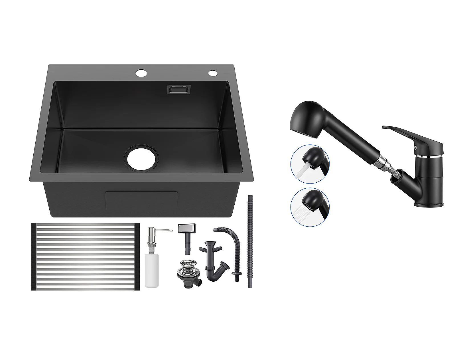 Évier Cuisine1Bac 58*45*18CM,avec Egouttoir évier Enroulable/Distributeur Savon+MitigeurCuisine avec Douchette Extractible Rotatif 360°,Noir