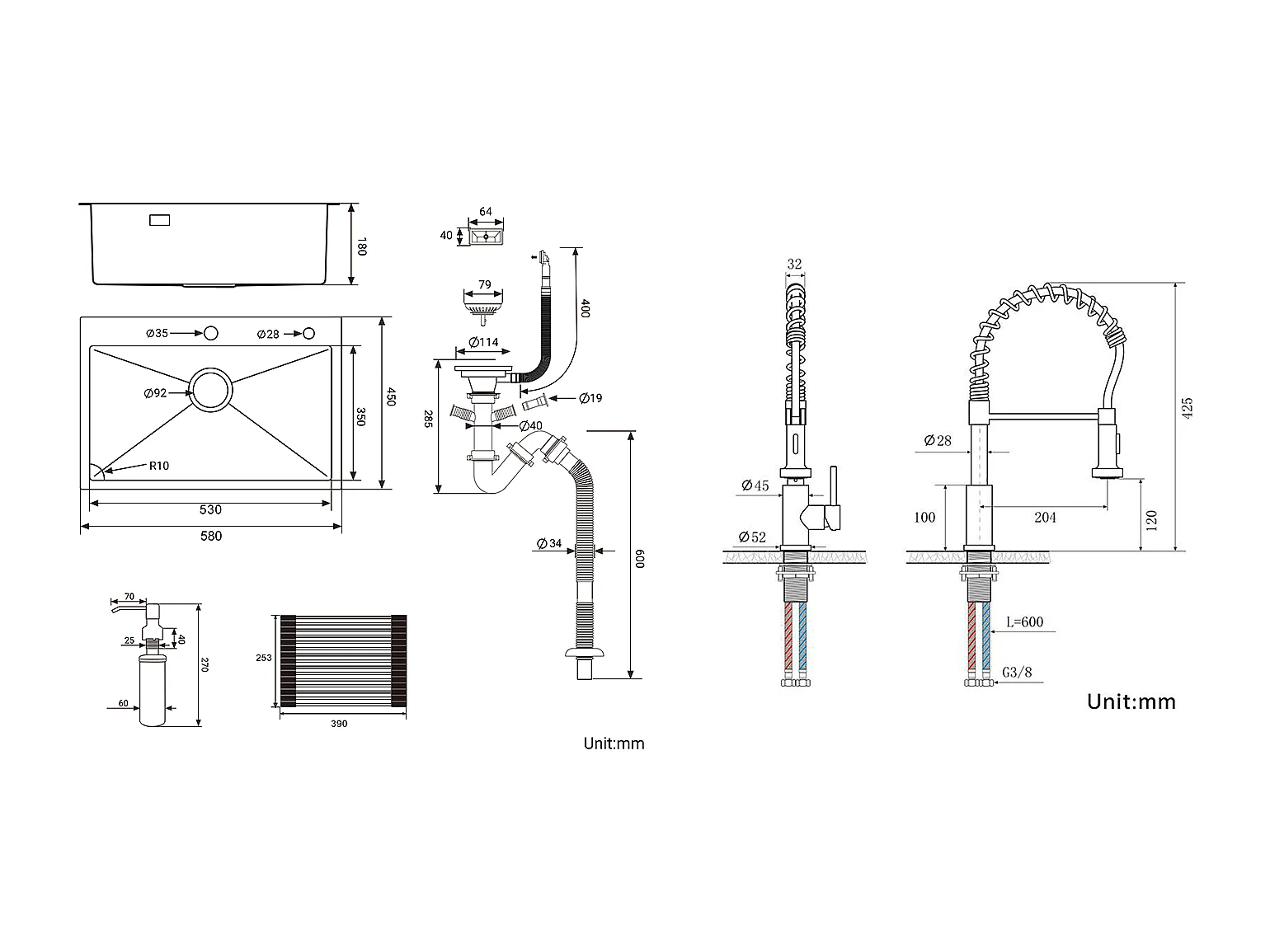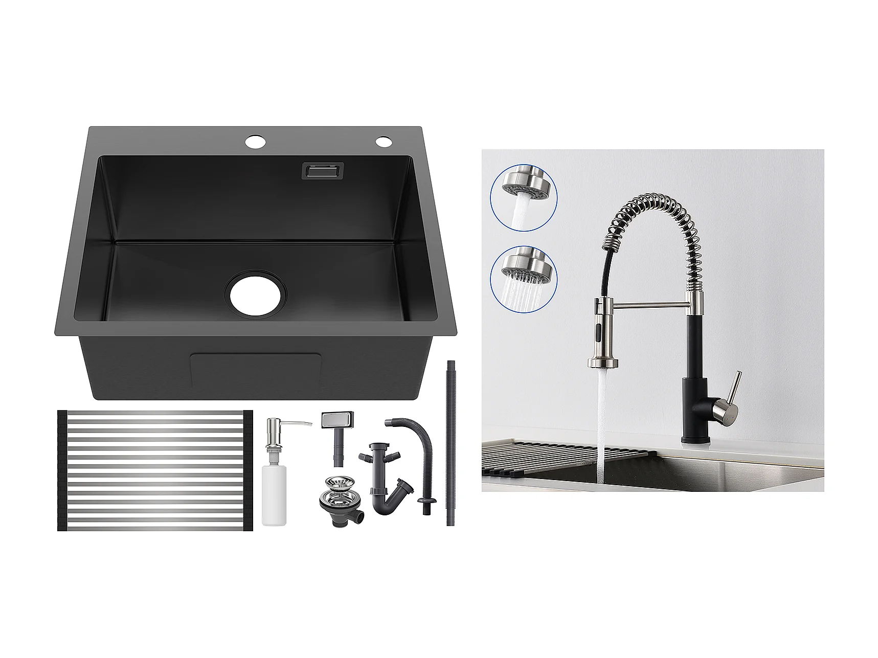 Évier Cuisine1Bac 58*45*18CM,avec Egouttoir évier Enroulable/Distributeur Savon+Robinet Cuisine Ressort avec Douchette Extensible,2 Modes,Noir