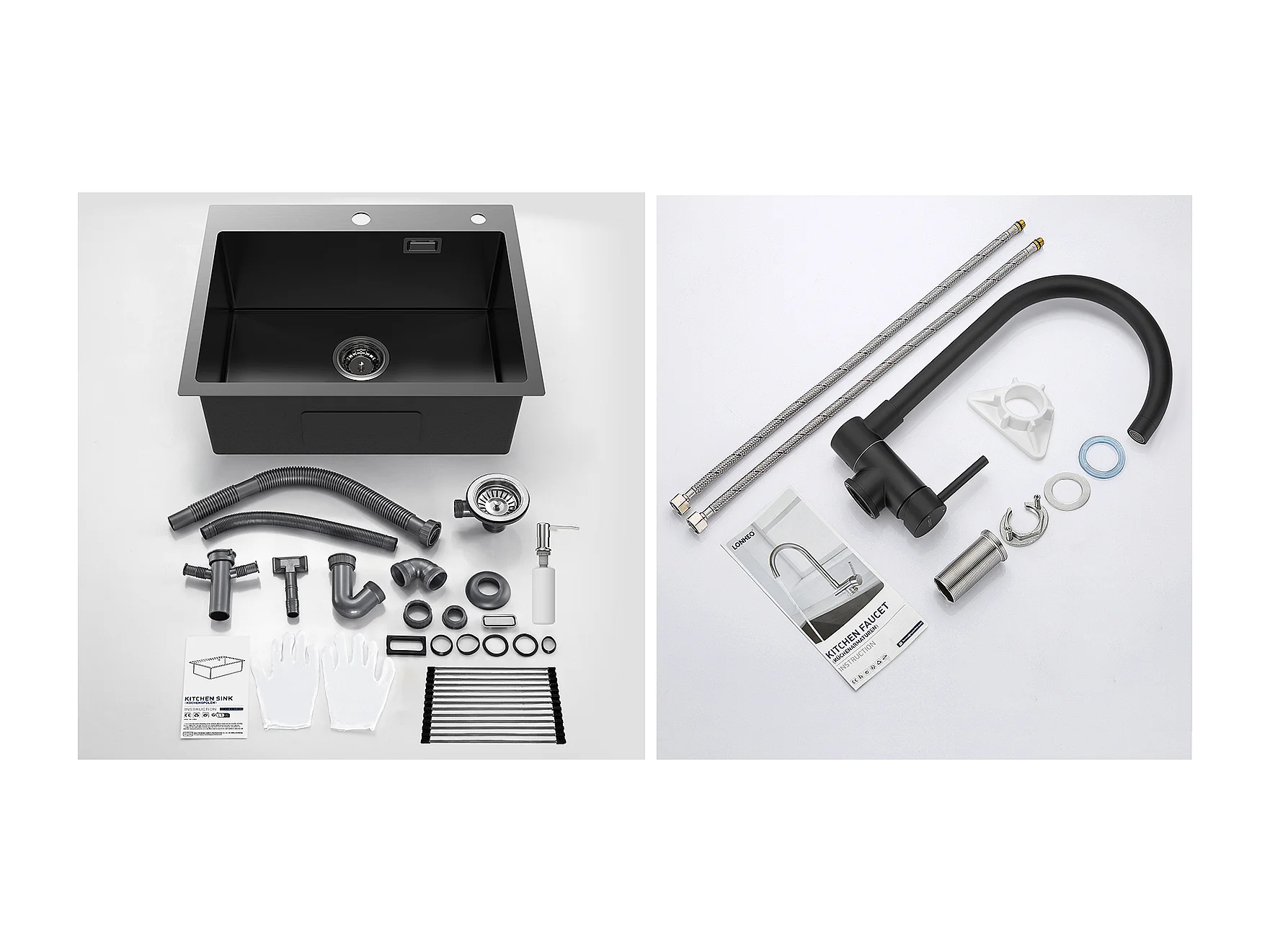 Évier Cuisine1Bac Noir 58*45*18CM,avec Egouttoir évier Enroulable/Distributeur Savon+Mitigeur Cuisine Inox Rabattable Pivotant à 360°,Noir