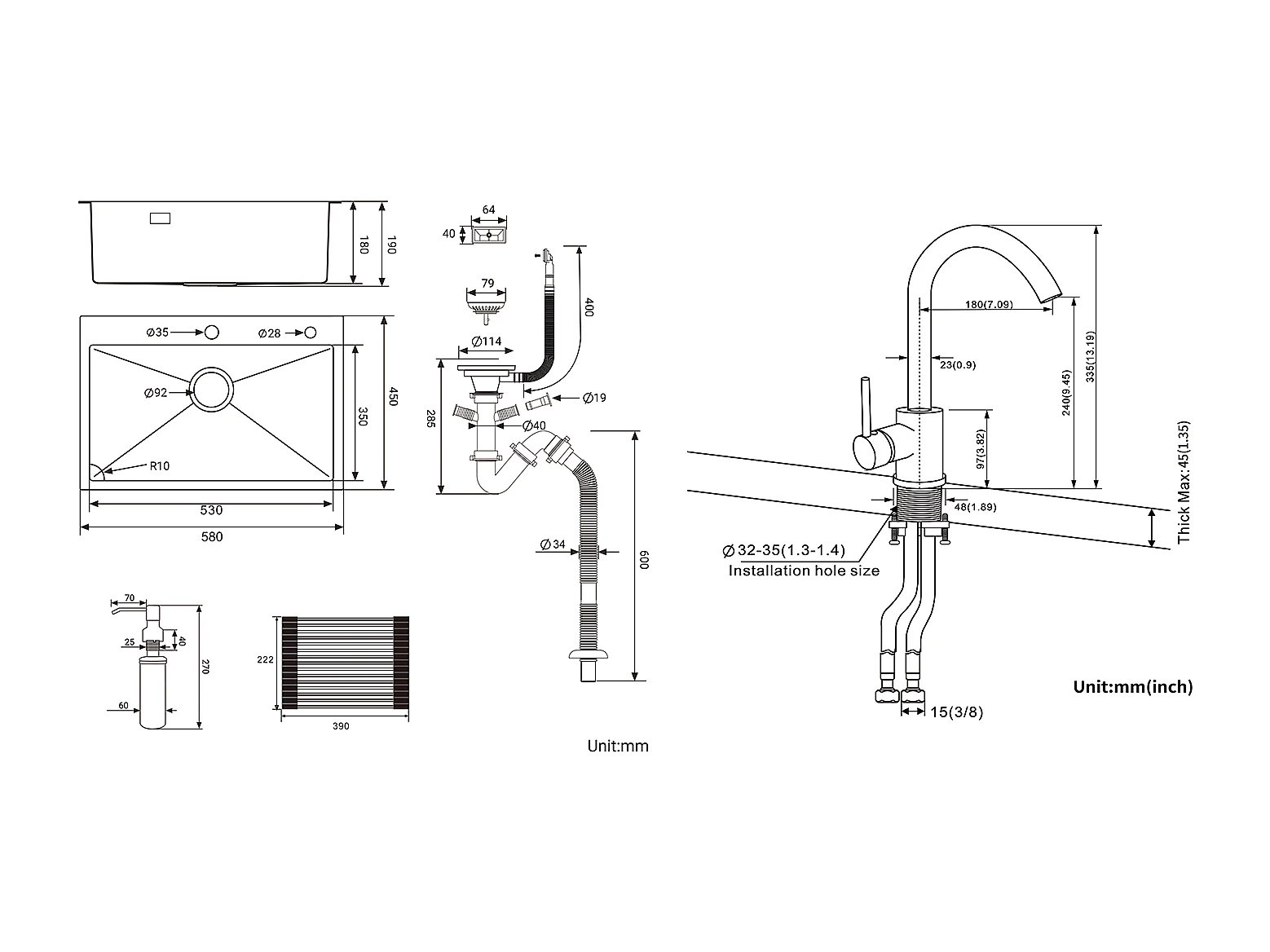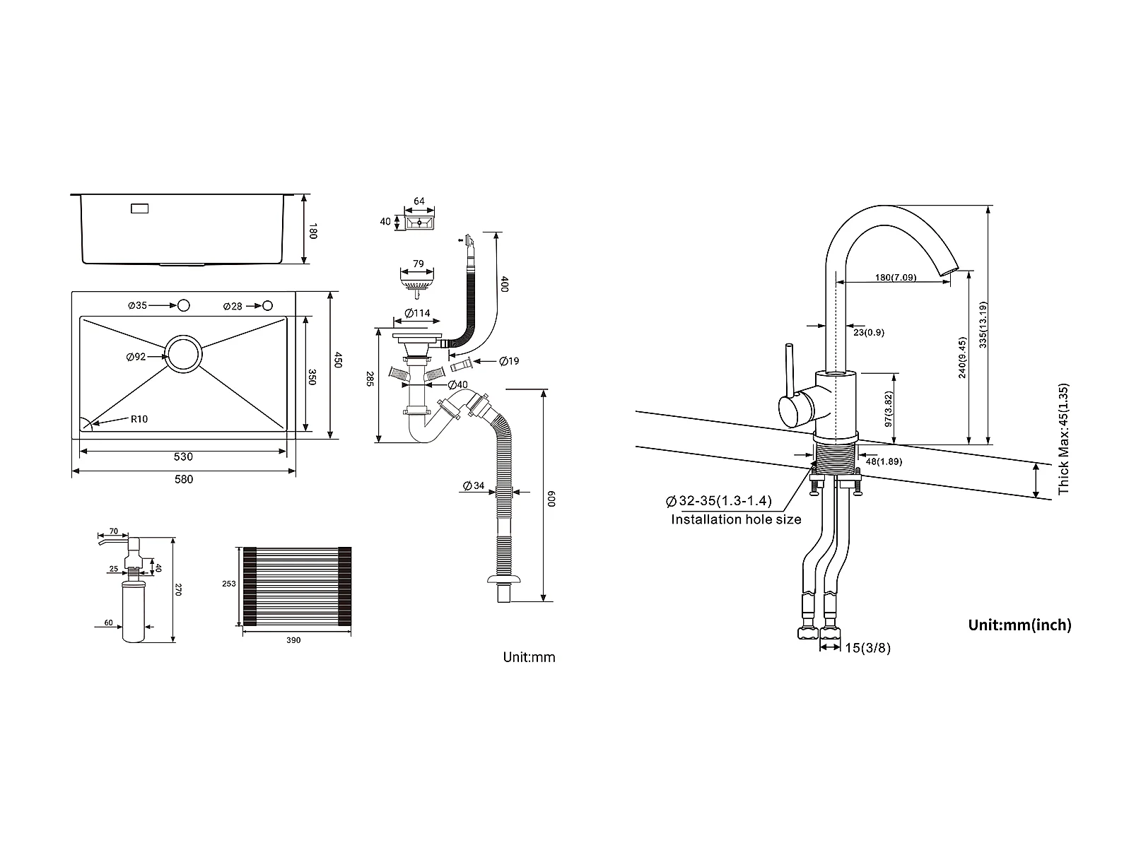 Évier Cuisine1Bac Noir 58*45*18CM,avec Egouttoir évier Enroulable/Distributeur Savon+Robinet Cuisine Rotatif 360° Noir avec points blancs