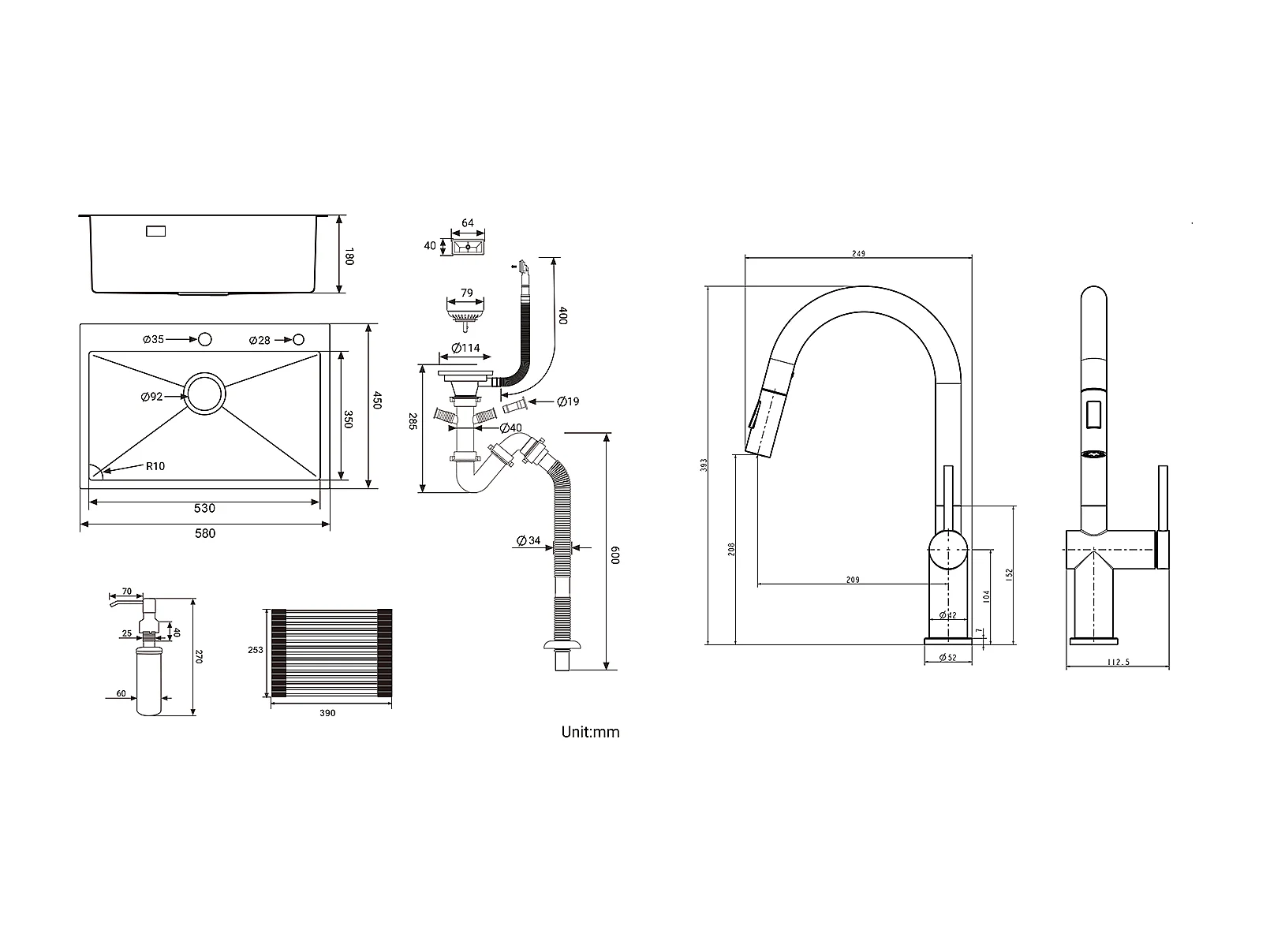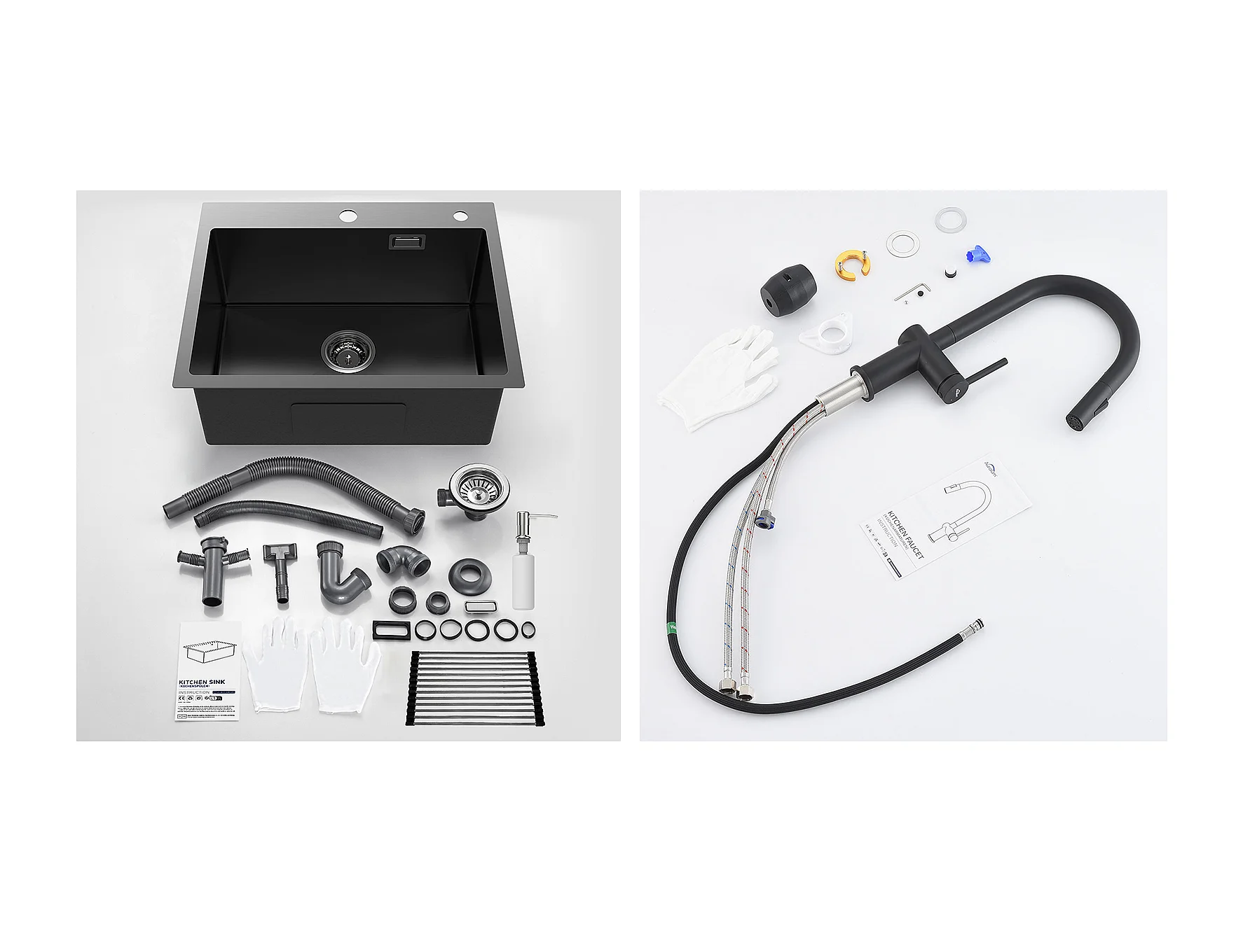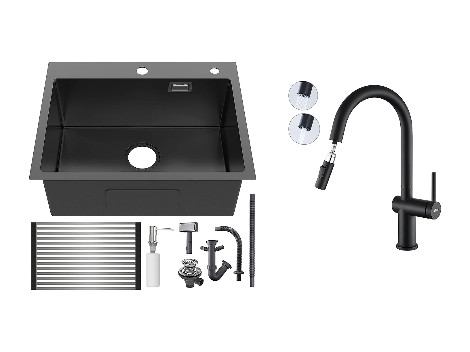 Évier Cuisine1Bac Noir 58*45*18CM,avec Egouttoir évier Enroulable/Distributeur Savon+robinet de cuisine rétractable à deux fonctions, Noir